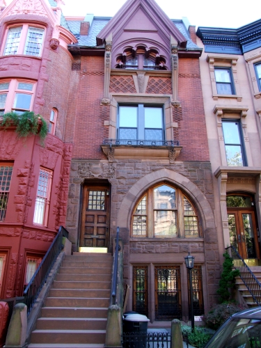 176 has fared better, and is the more impressive house, anyway. Where to begin? The cherub caryatid brackets holding up that incredible trefoil accented Gothic dormer. Woah! The Gothic window on the parlor floor, extending down to the window on the garden level is just perfect in scale, and quite beautiful. The masterful mix of materials: rough cut stone, elegant brickwork, terra-cotta, wood and glass. The two doctors who originally lived here in side by side houses must have been happy. I would be, too. GMAP
