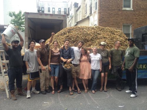 The non-profit group Compost for Brooklyn held its annual block party in Kensington yesterday. To celebrate, ‘cuz that’s how they roll, members pitched in to create a 7,000-pound pile of compost using food scraps as well as wood shavings from local woodworkers and landscapers. The compost mostly ends up getting used for a network of community-based projects like the Red Hook Community Farm, Brooklyn Grange and Projects EATS but the public can also get their hands on some at Build It Green! and the Union Square Greenmarket. Great stuff!