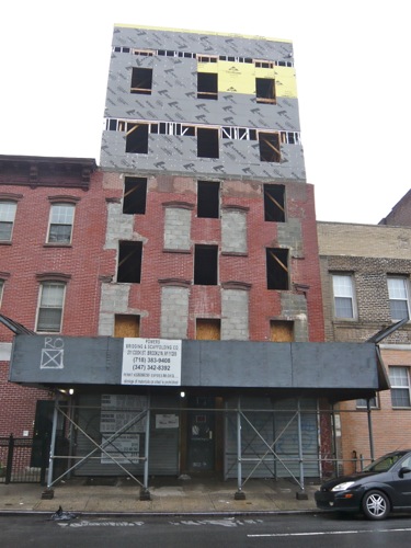 Now here is a curious sight: The owner of this building at 843-845 Dekalb is converting it from a four-family with two commercial units to a 10-family, adding two stories, and changing the position of all the windows on the front. Once the original facade is covered over with stucco, as per the permits, all trace of the old windows will be gone. GMAP
