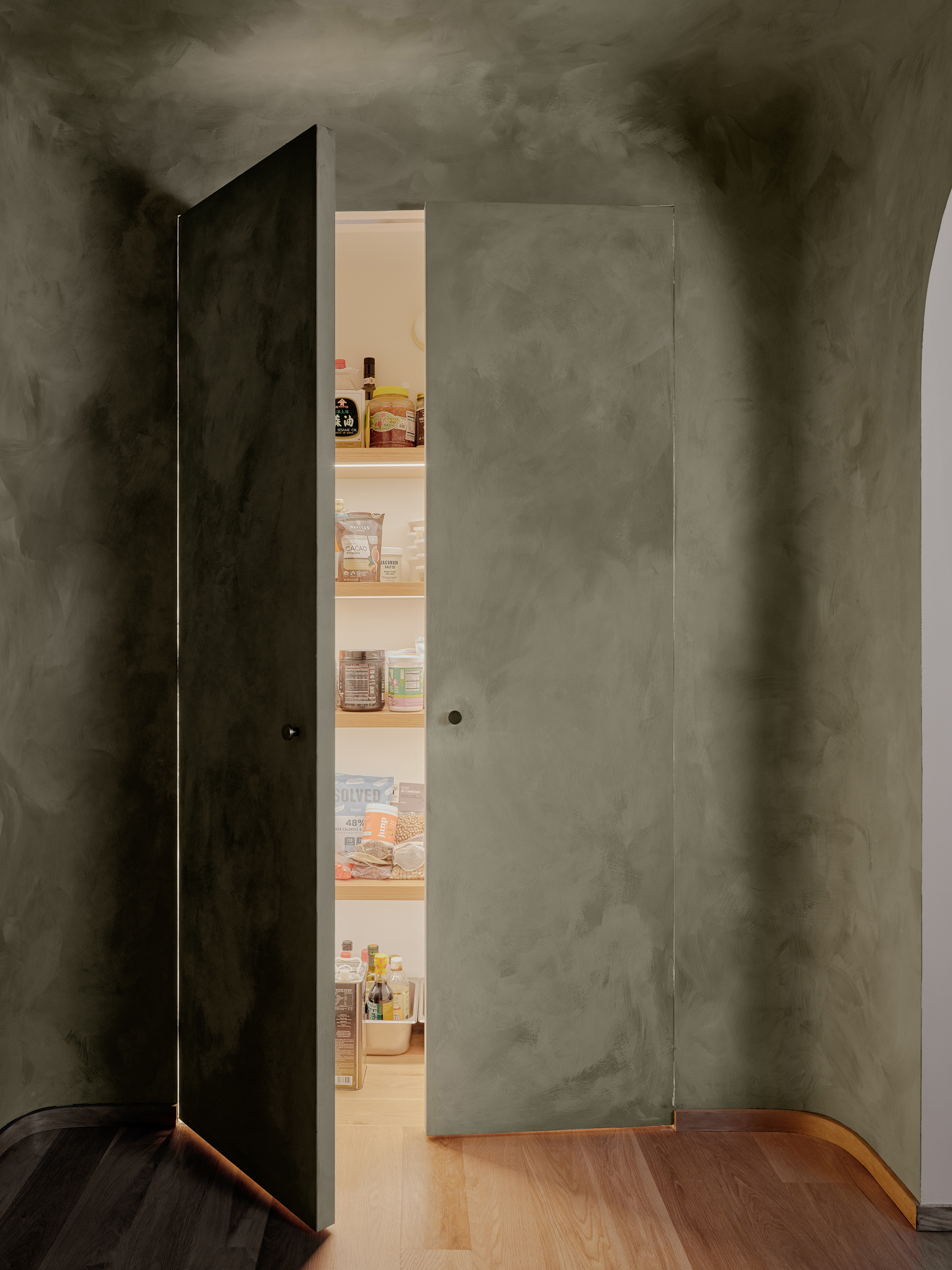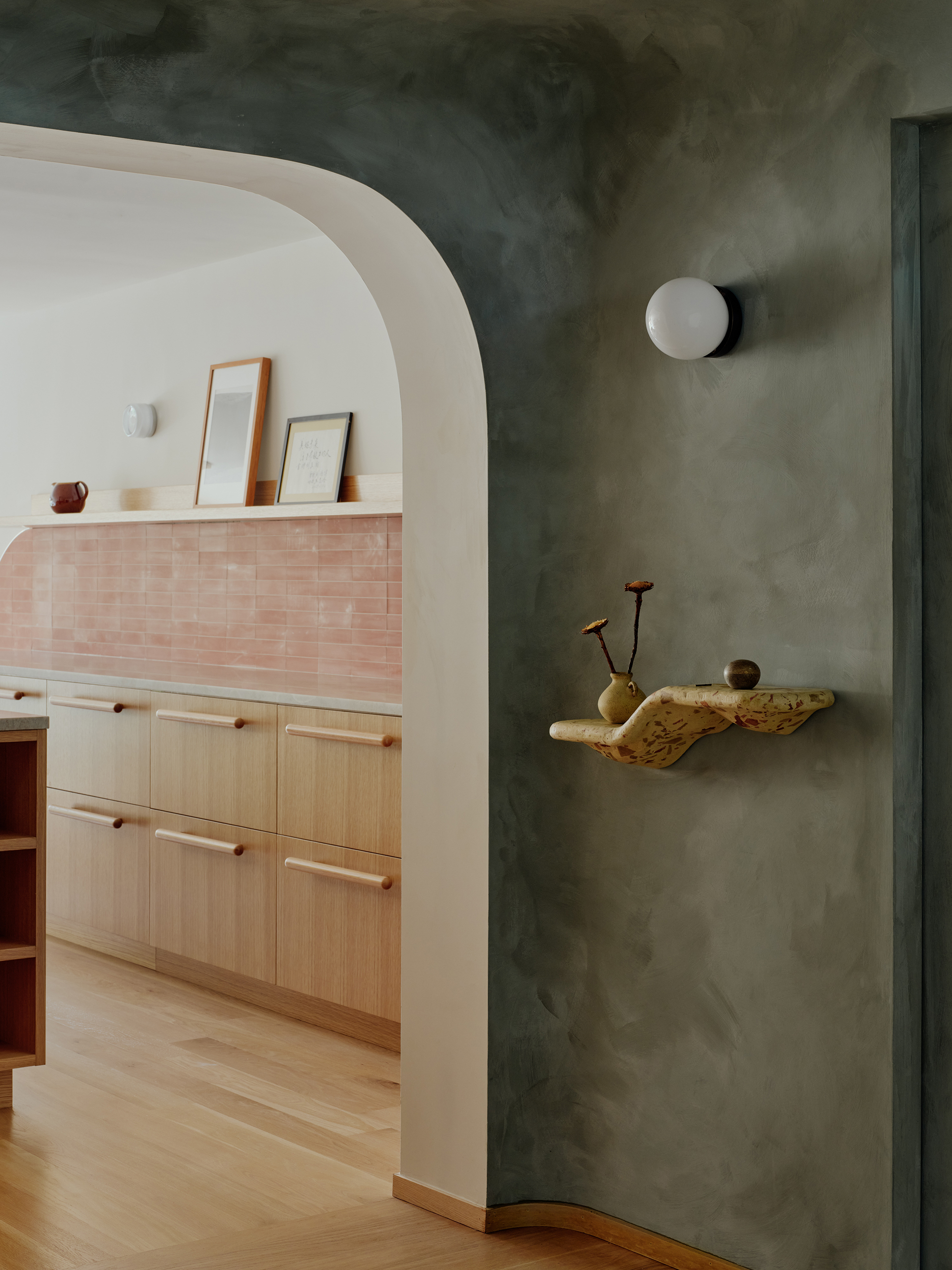 The transitional space between the two new archways, containing a new pantry and new powder room, is lime-washed green “like vegetation,” Oh said.