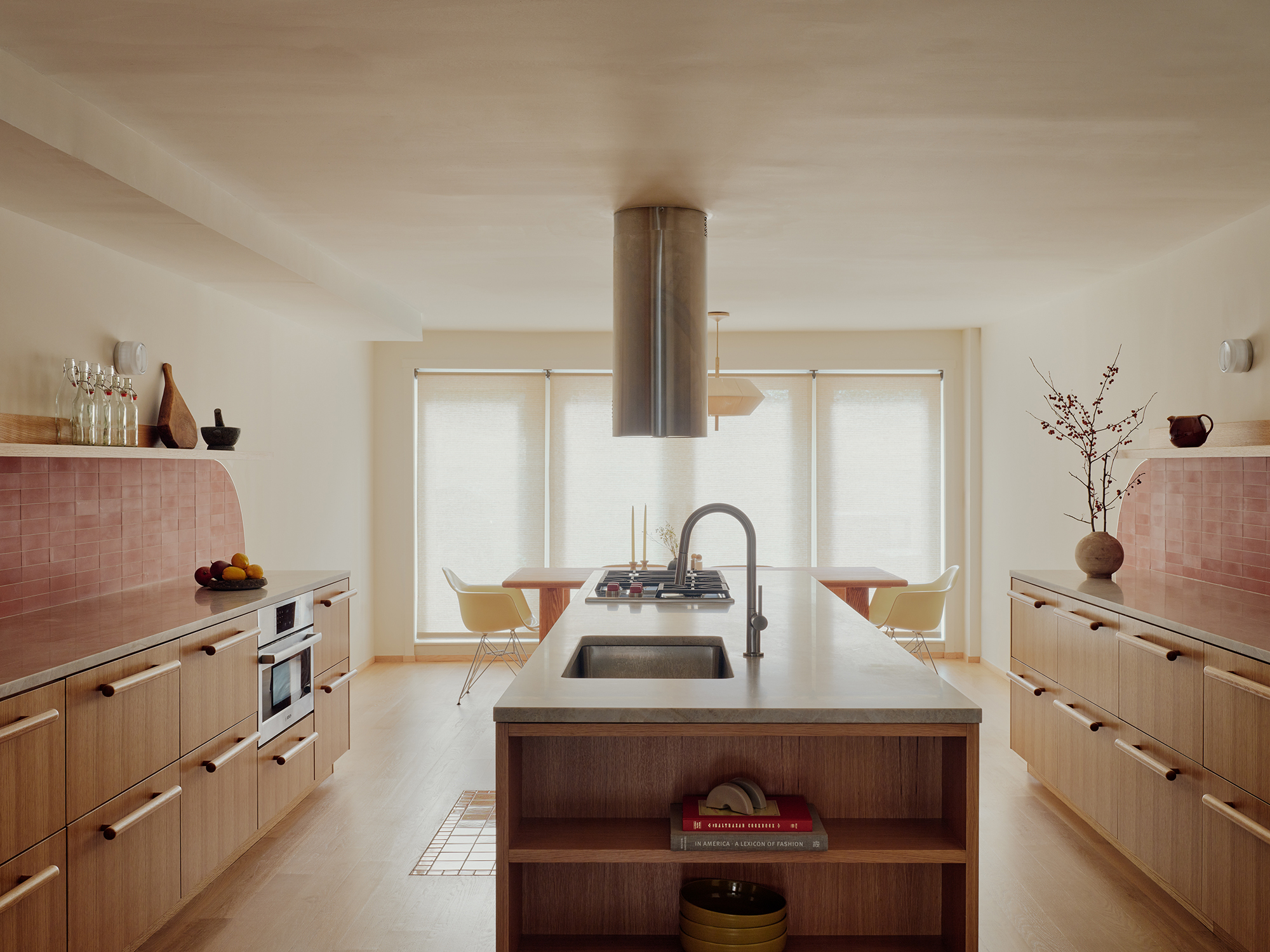Studio Oh-Song conceived the kitchen’s cylindrical range hood, fabricated by Faber, as “a really simple sculpture,” Oh said. “Often range hoods are concealed in drywall, but given that the cooking area is in the middle of the room and we needed ventilation, we decided to make it a feature reminiscent of industrial kitchens, with a contemporary look.”