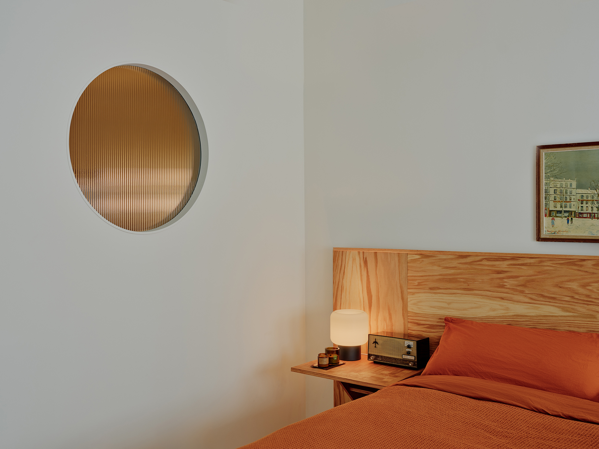 The primary bedroom’s porthole window brings natural light into the bathroom behind. Fluted glass reads as different colors throughout the day.