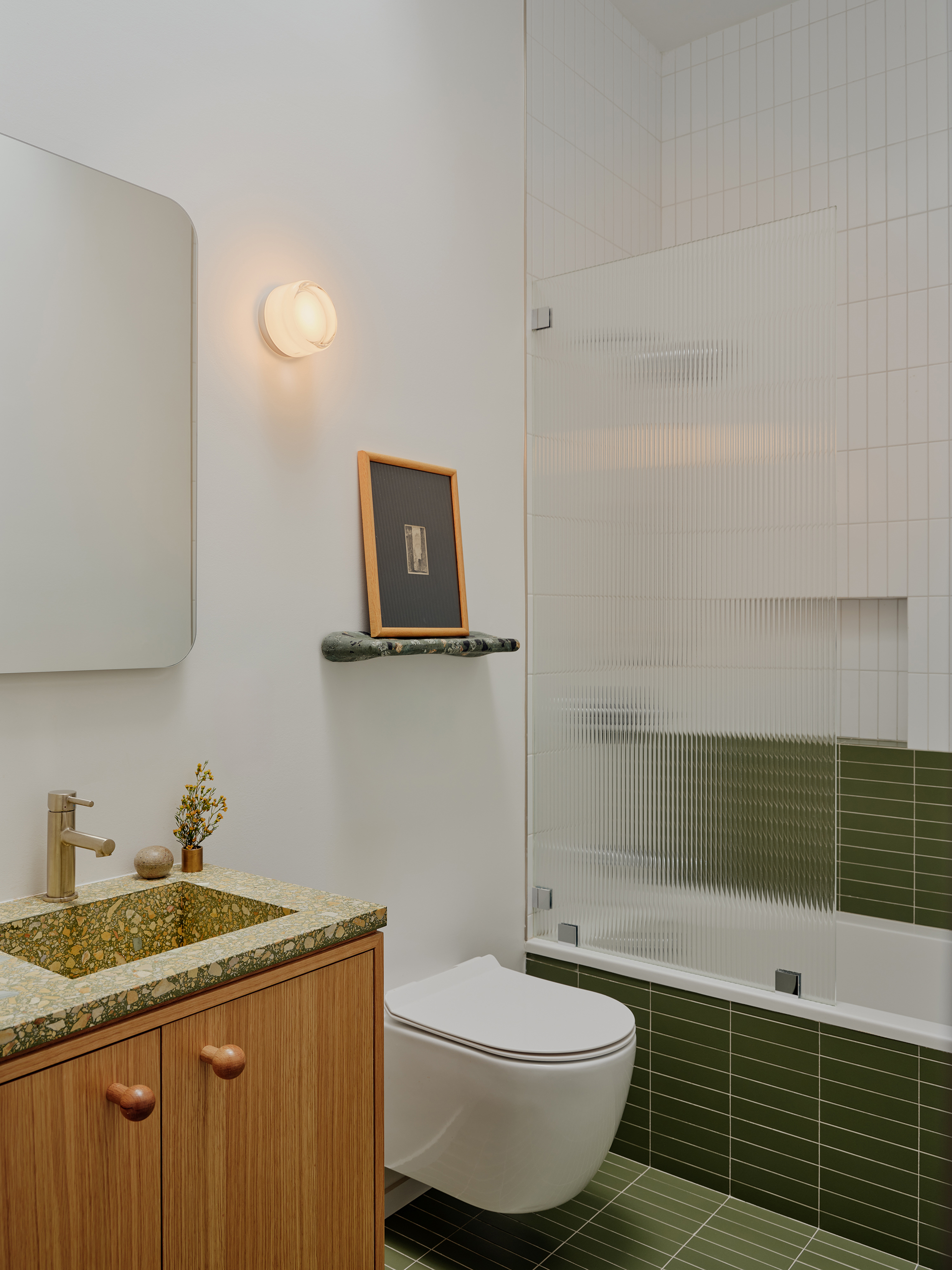 The powder room, replacing a full bath from which a shower was removed, is tucked out of the way behind a pocket door. The quirky terrazzo shelf was sourced from Brooklyn’s Osprey Studio.