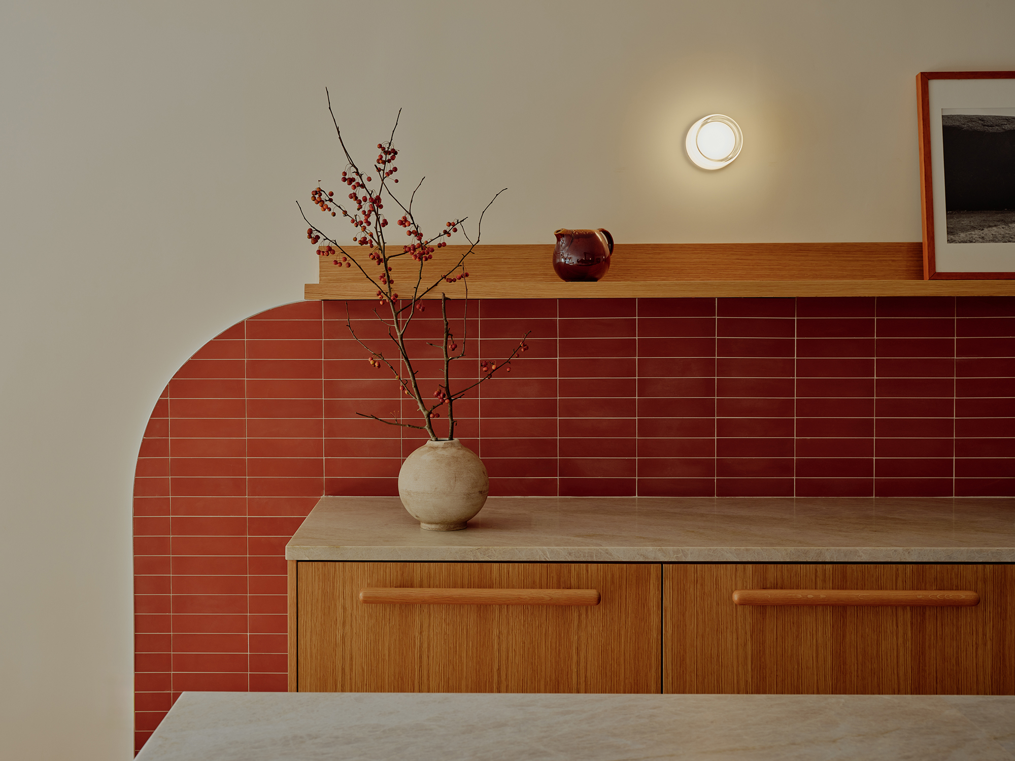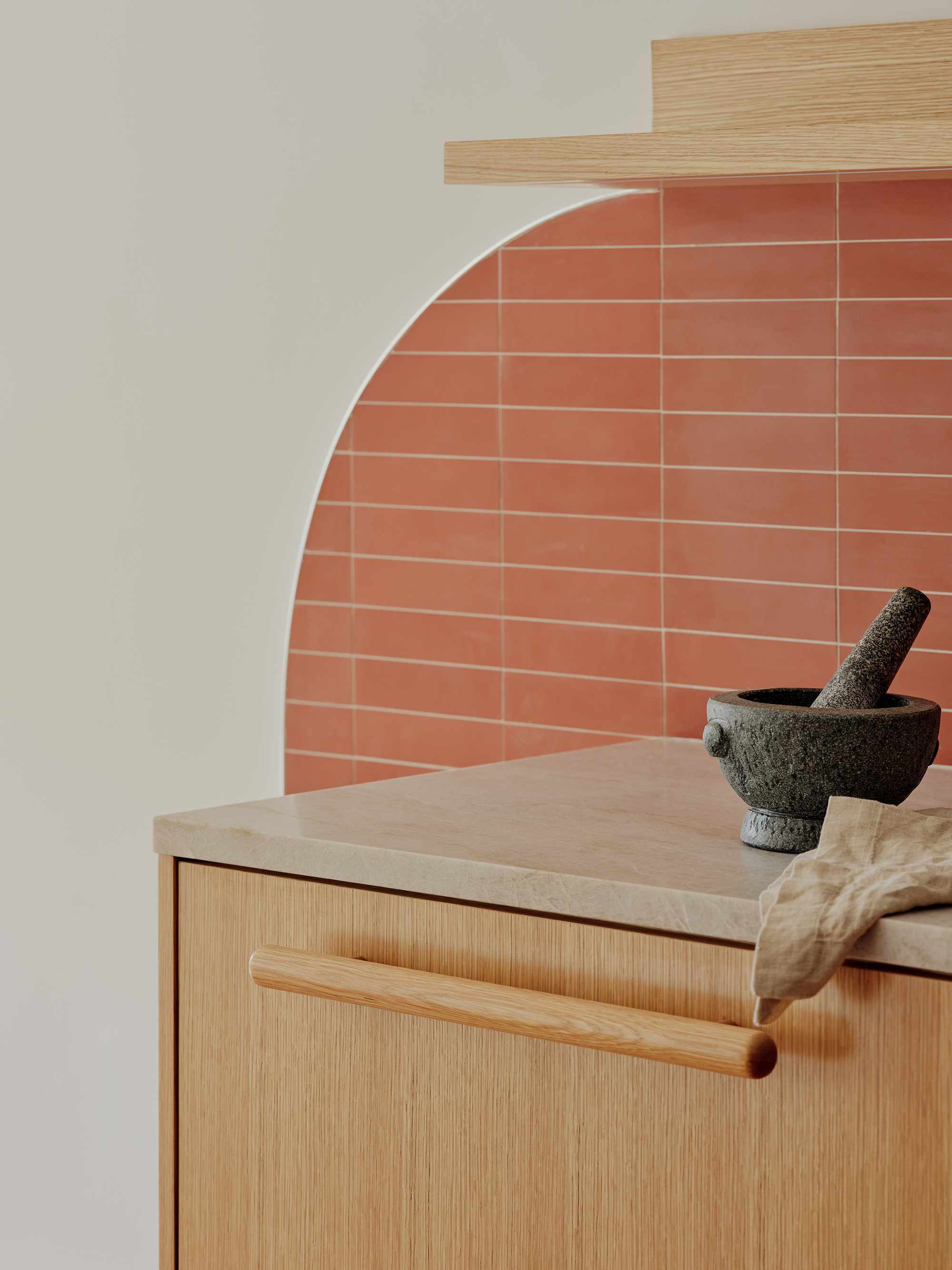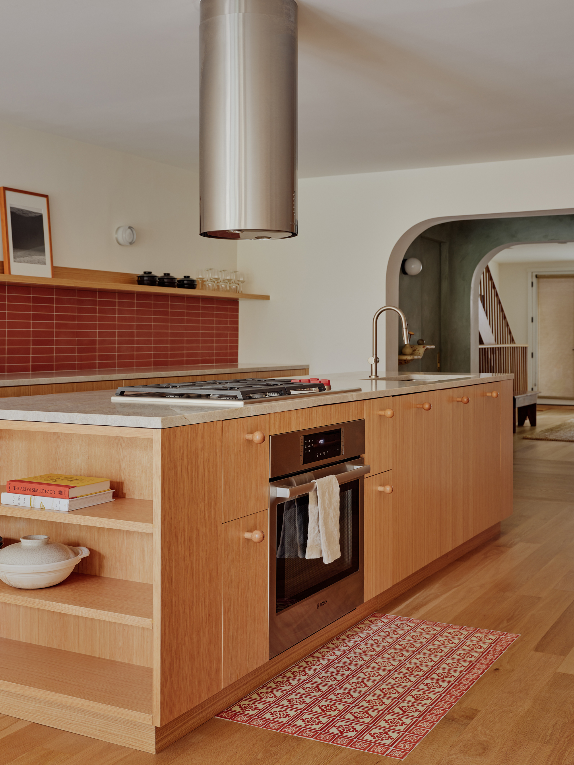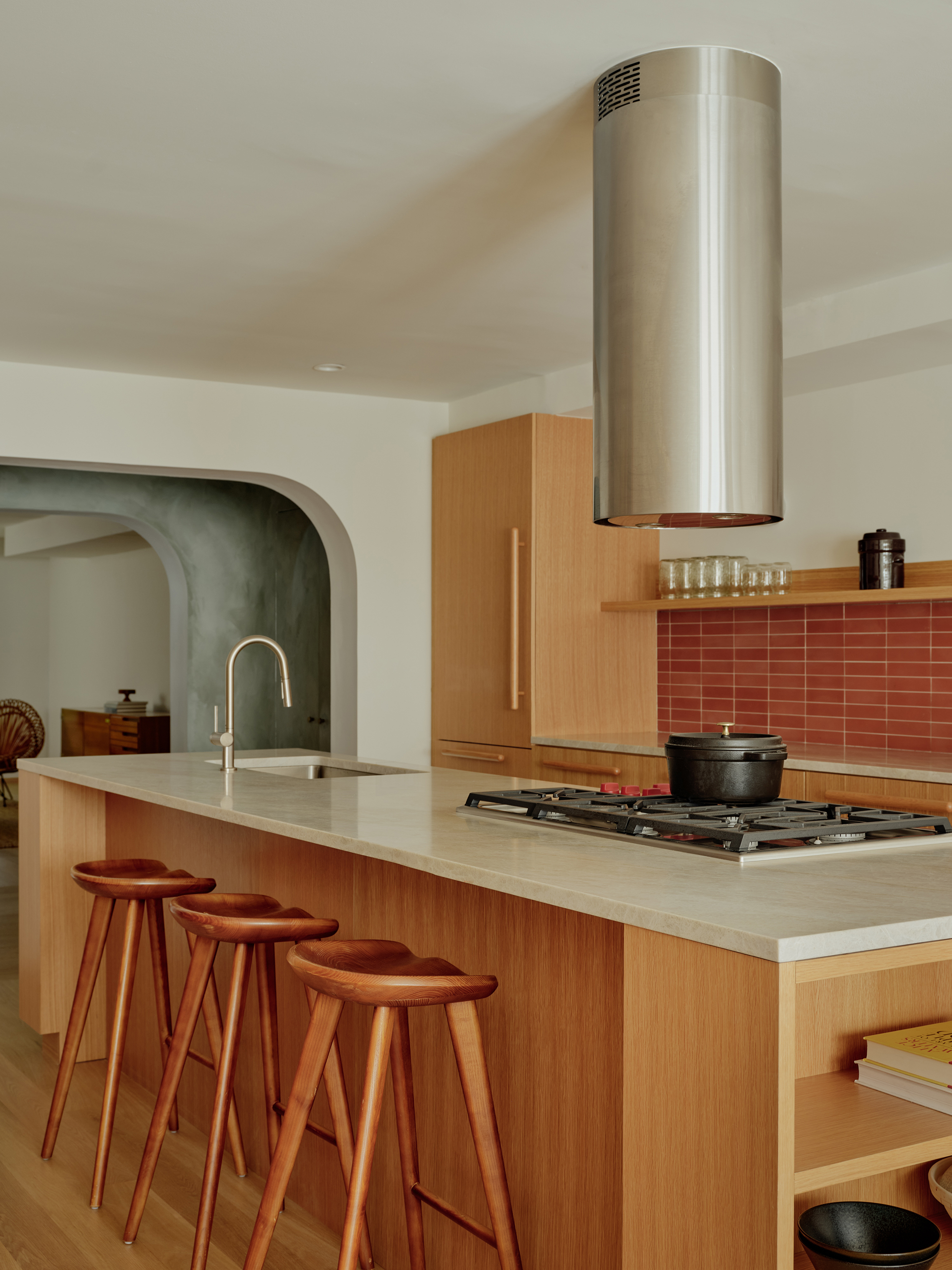 Pearlescent gray quartzite for countertops was chosen for its warmth and softness. Rounded shapes appear in the archway radius and red tile backsplash, which comes down to meet the floor. The same palette of stone, wood, and tile carries through to other parts of the project.