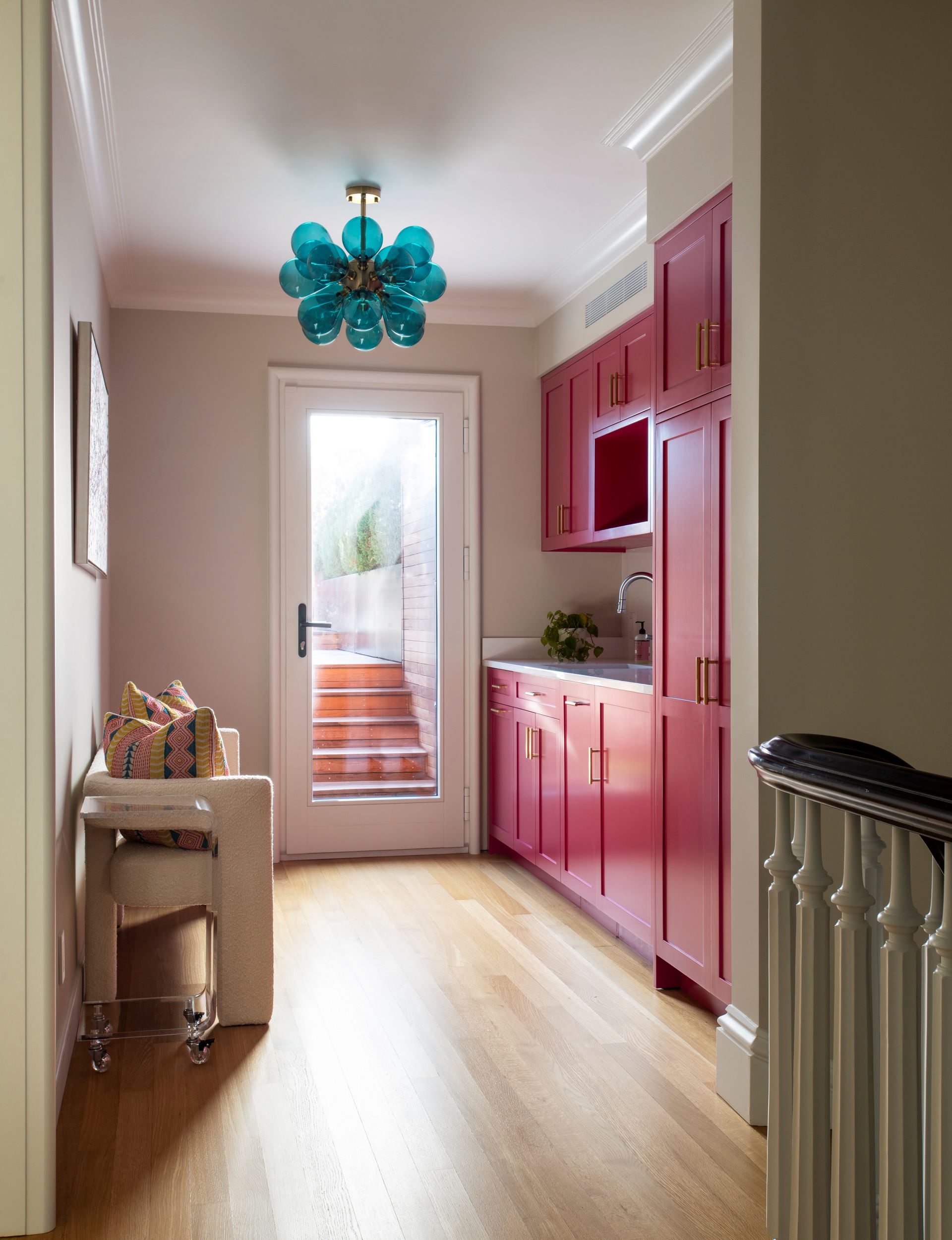 A hot pink kitchenette adjoining the lounge and roof deck makes for easy entertaining.