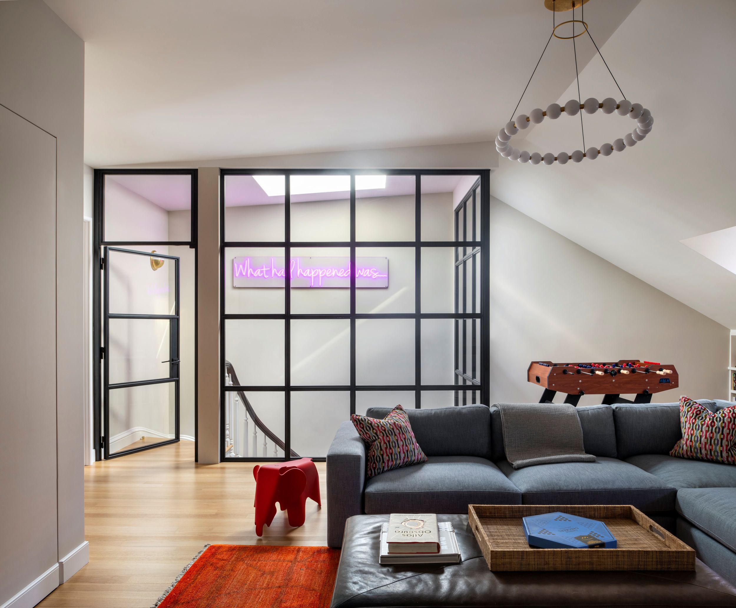 The space at the top of the house, set apart by a steel and glass enclosure, is furnished with a sectional from Crate & Barrel, an Orbit chandelier from Visual Comfort, and a Moroccan rug. It is a dream lounge for the family’s three lucky teenagers.