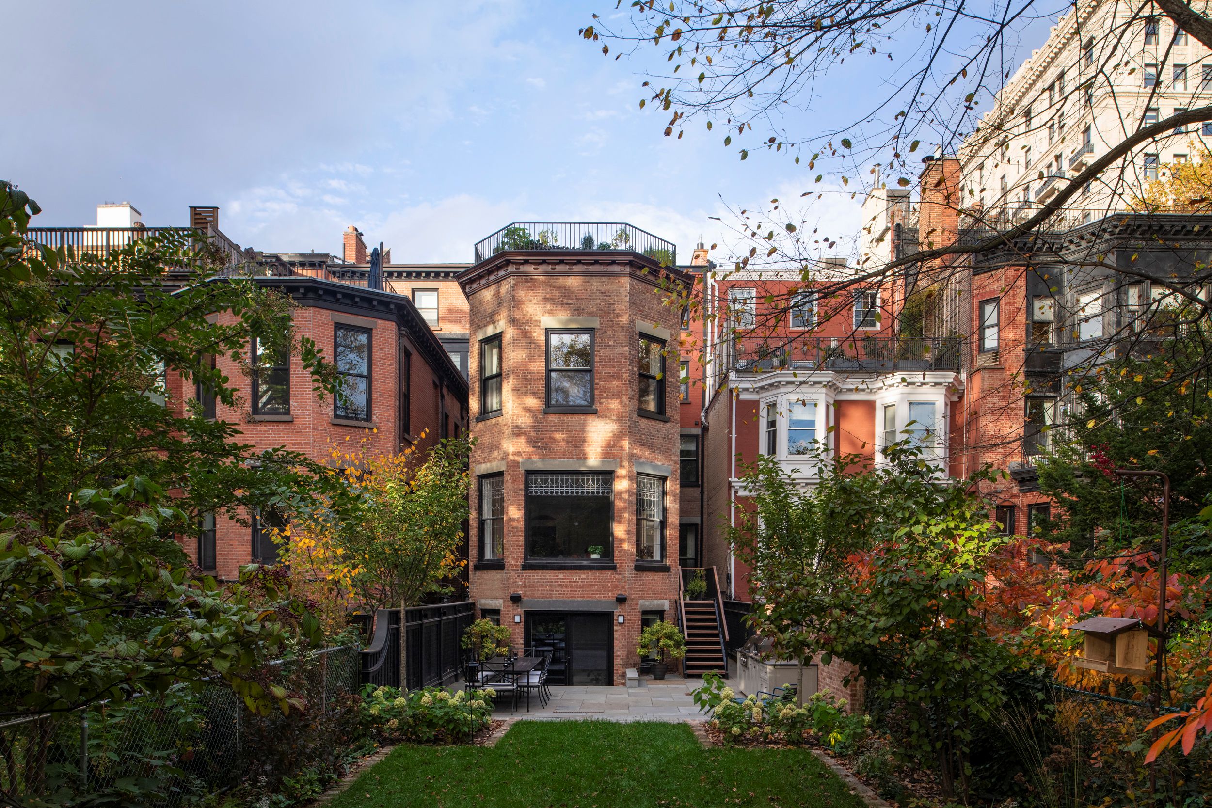 The massive roof deck was built by the general contractor and landscaped by Brooklyn-based Project Plant, as was the rear yard, with furnishings sourced from Restoration Hardware.