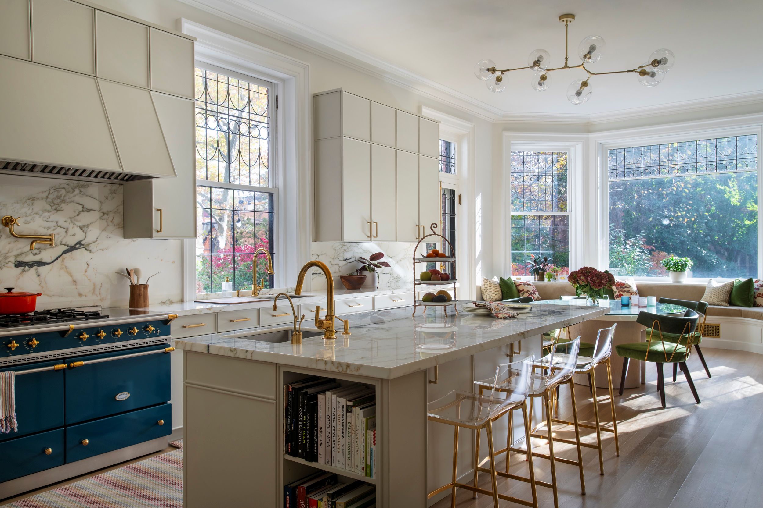 Custom cabinetry of painted wood rimmed with bead detail is topped with the same Calacatta Noir marble that forms the backsplash. It is “neither traditional nor super modern,” Ingui said. Both the range and the restored leaded glass windows “want to be a star, so the cabinets have to be a little bit of a supporting player.”