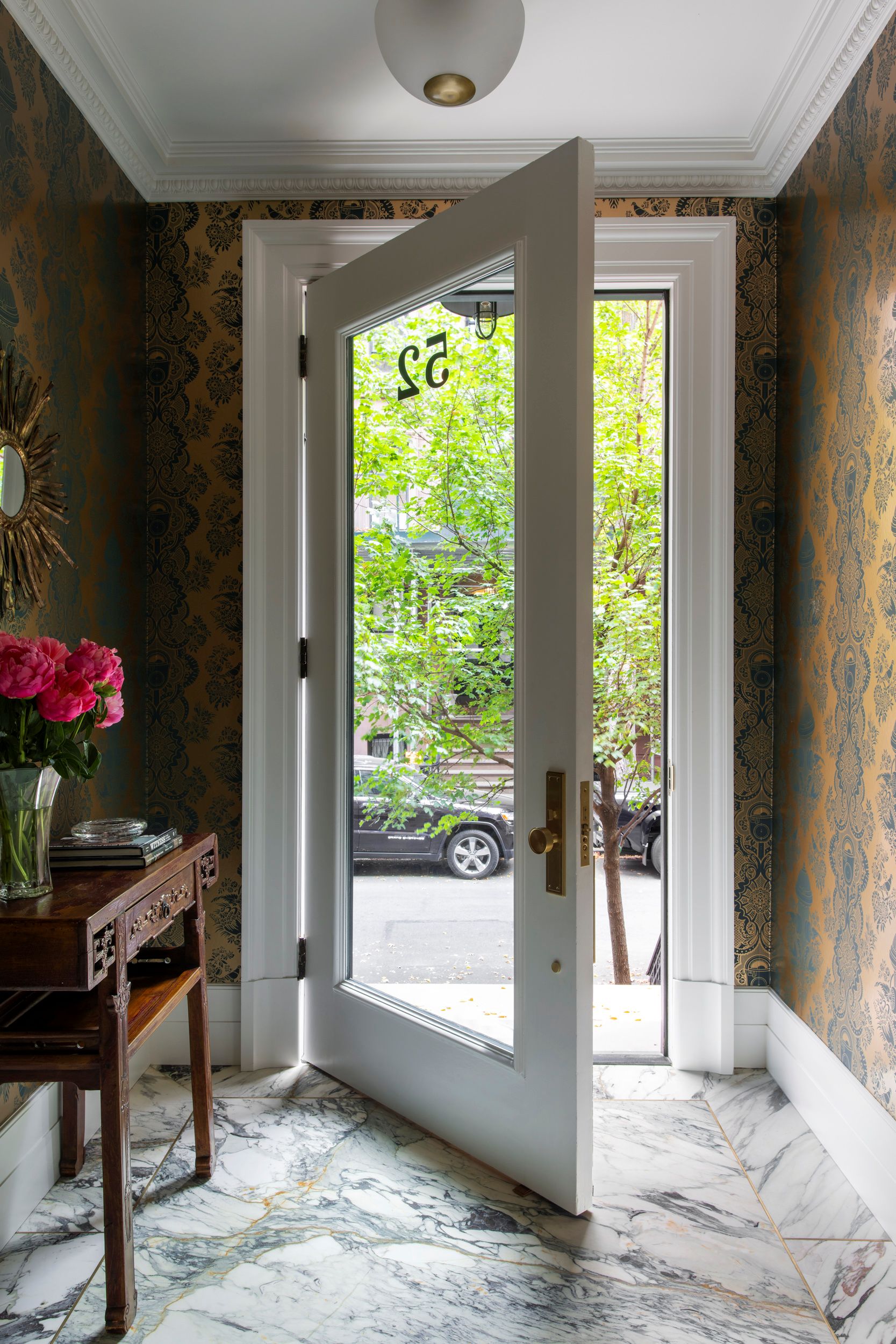 A custom marble floor with brass detail, an antique Asian console, and wall covering from Brooklyn’s own Flavor Paper in the entry vestibule set an adventurous tone from the get-go.