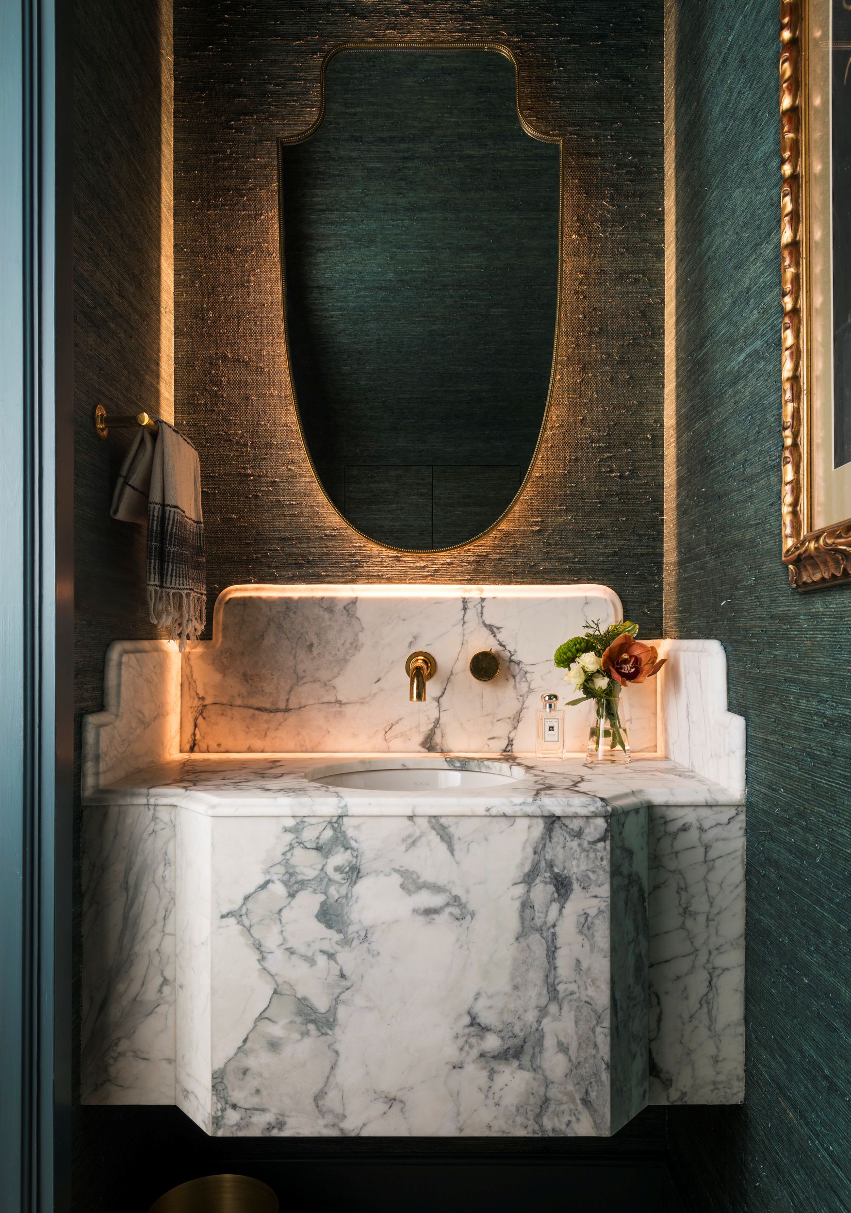 A rather magical powder room on the parlor floor is defined by moody grasscloth wall covering and a custom sink of Calacatta Turquoise Antico marble.