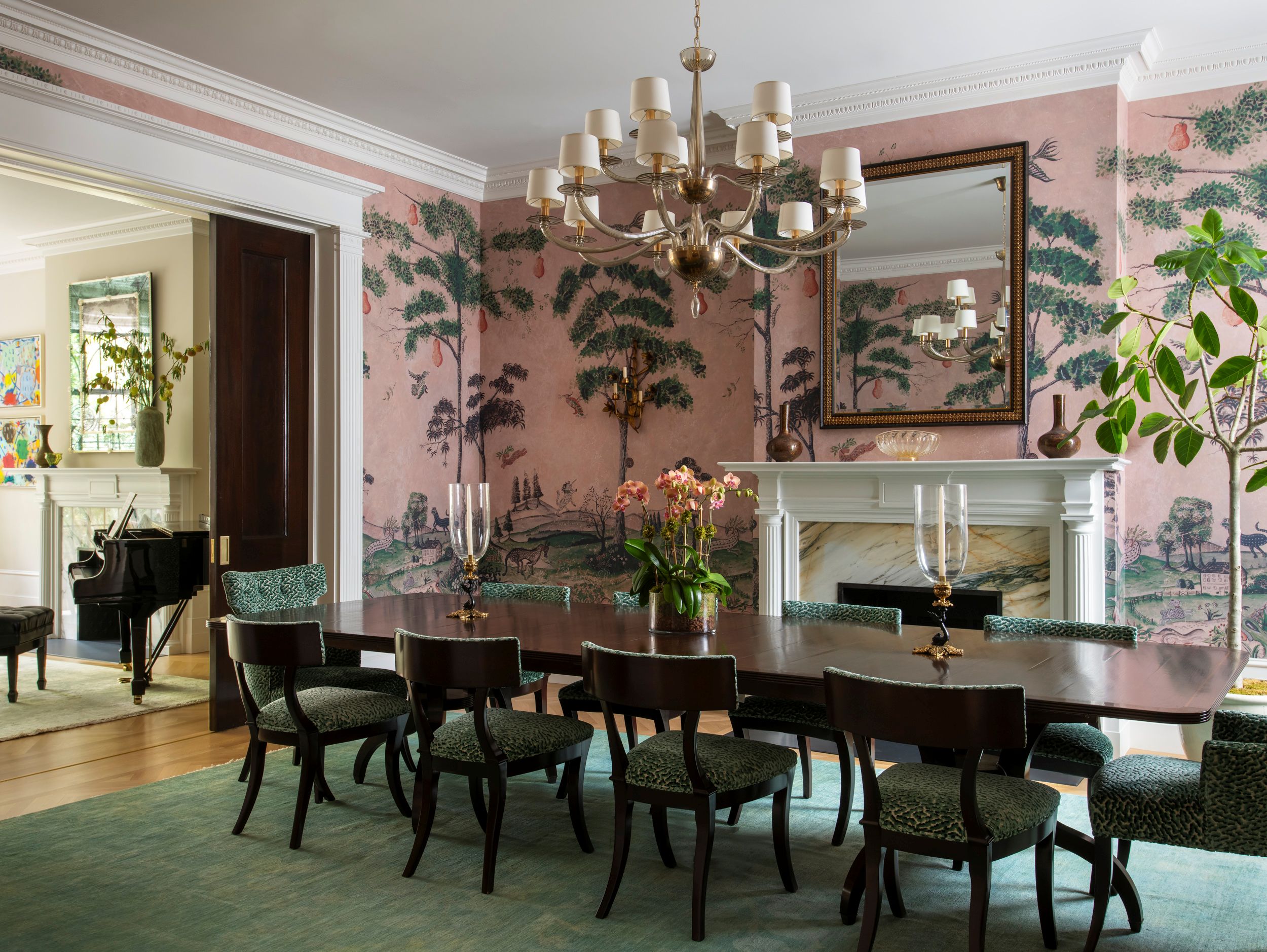 Mythical Land wallpaper by Kit Kemp for Andrew Martin in the dining room was among the first decorating decisions, establishing the color palette and whimsical bent to carry through the rest of the house. The room’s custom furnishings include a table by John Rosselli, chairs from Artistic Frame, and a Murano chandelier from Multiforme. An overdyed wool rug from Pakistan lies beneath.