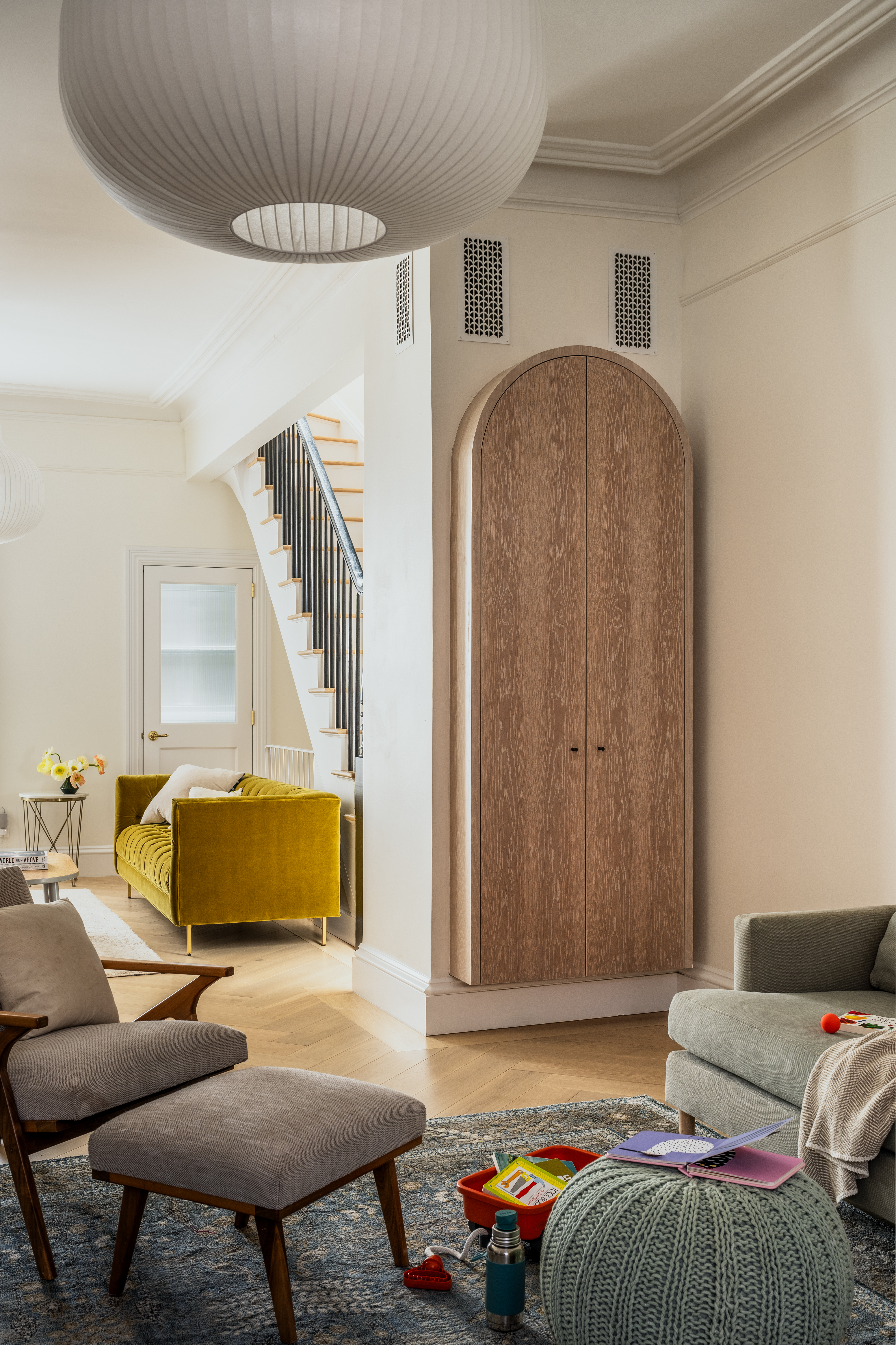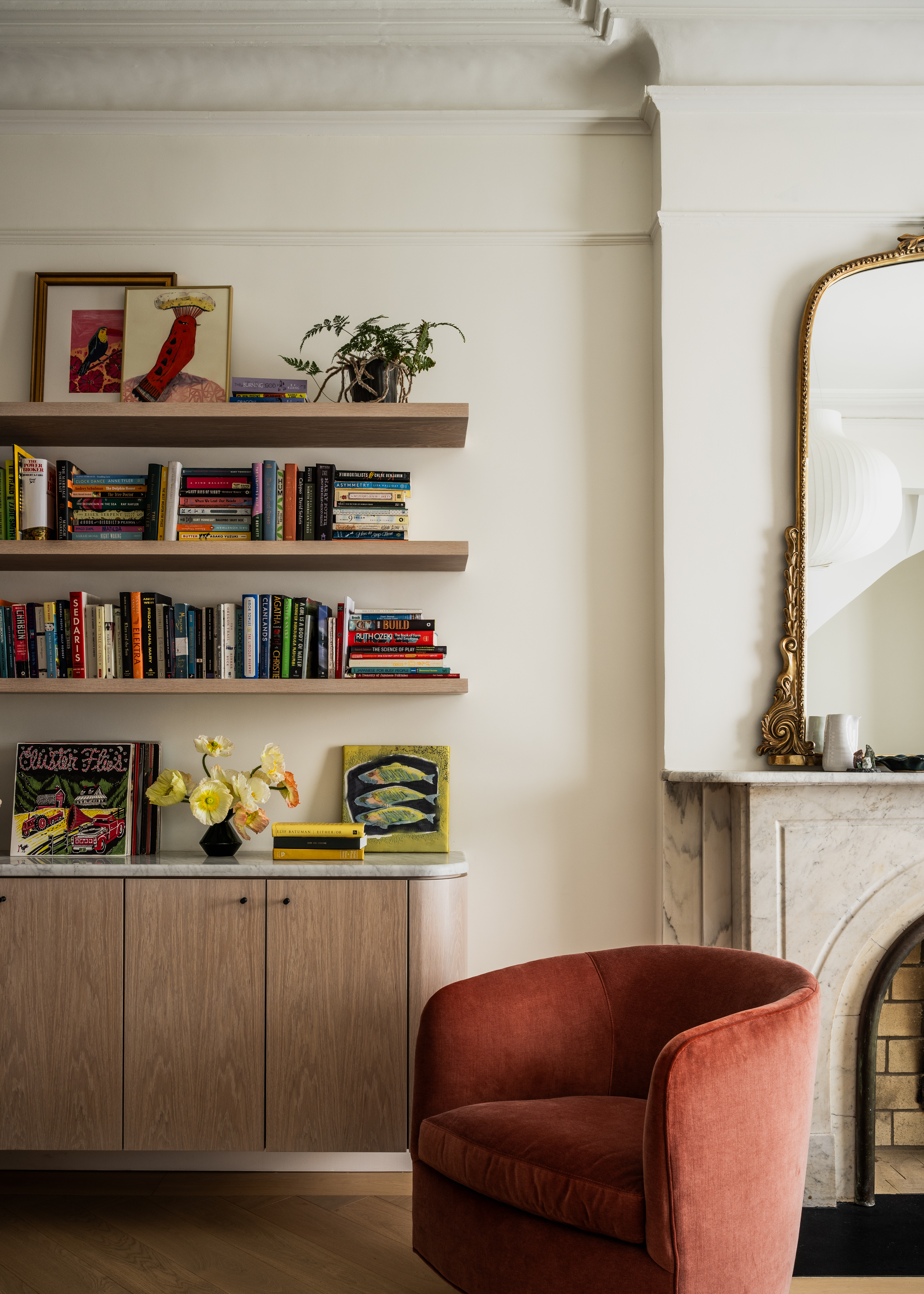 The entire parlor level is conceived as a living room with two separate seating areas. A unique arched storage unit floats on the wall toward the front of the space; open shelving with a curved built-in console beneath fills the area between twin fireplaces.