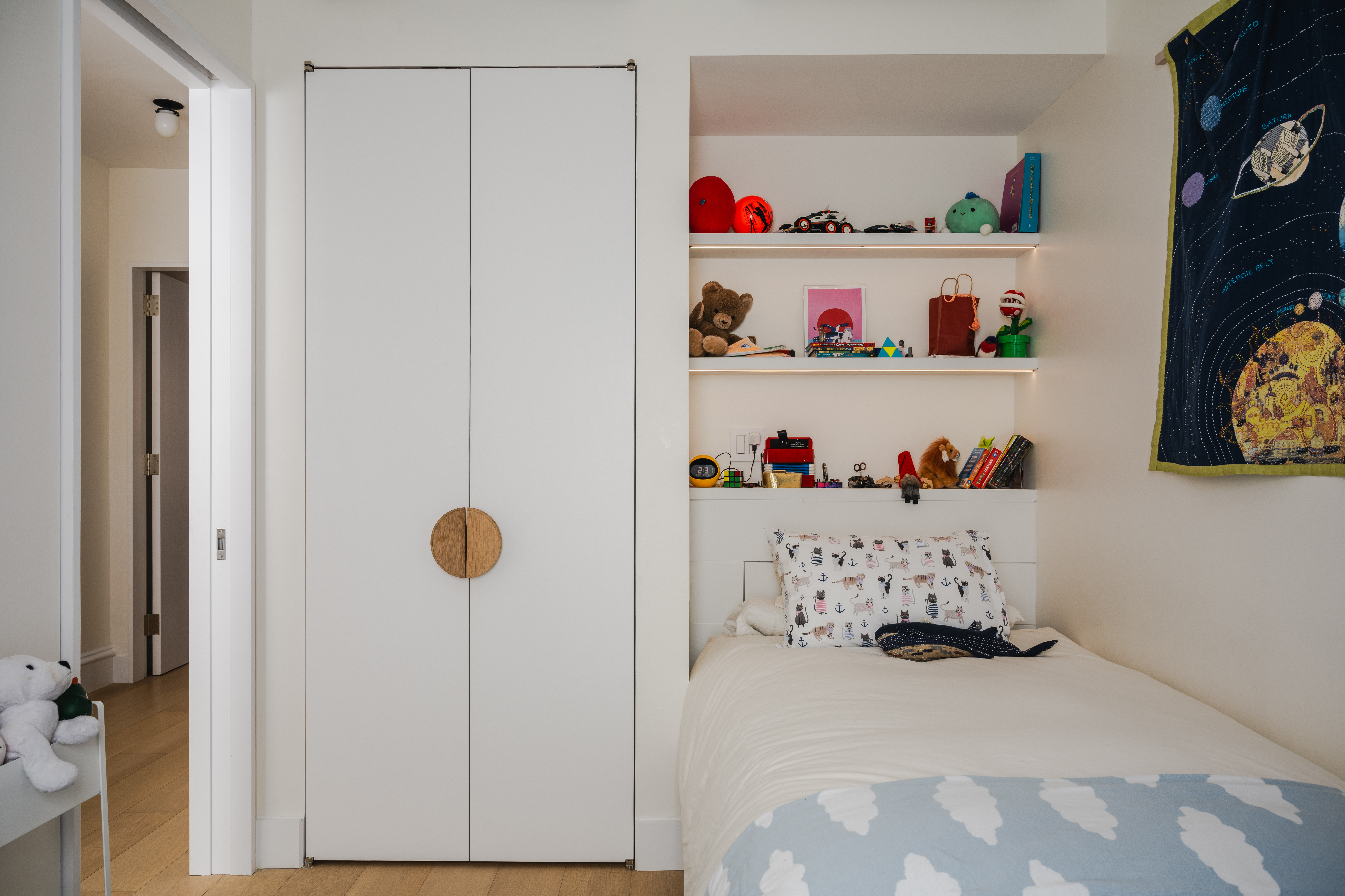 Two children’s rooms and a bath occupy the second floor. “The room was tiny, so we wanted to give it some special features,” Scheel said, including a secret panel in the built-in headboard for storing a child’s treasures. Distinctive oak closet pulls were sourced from Designer Doorware, based in Melbourne, Australia.