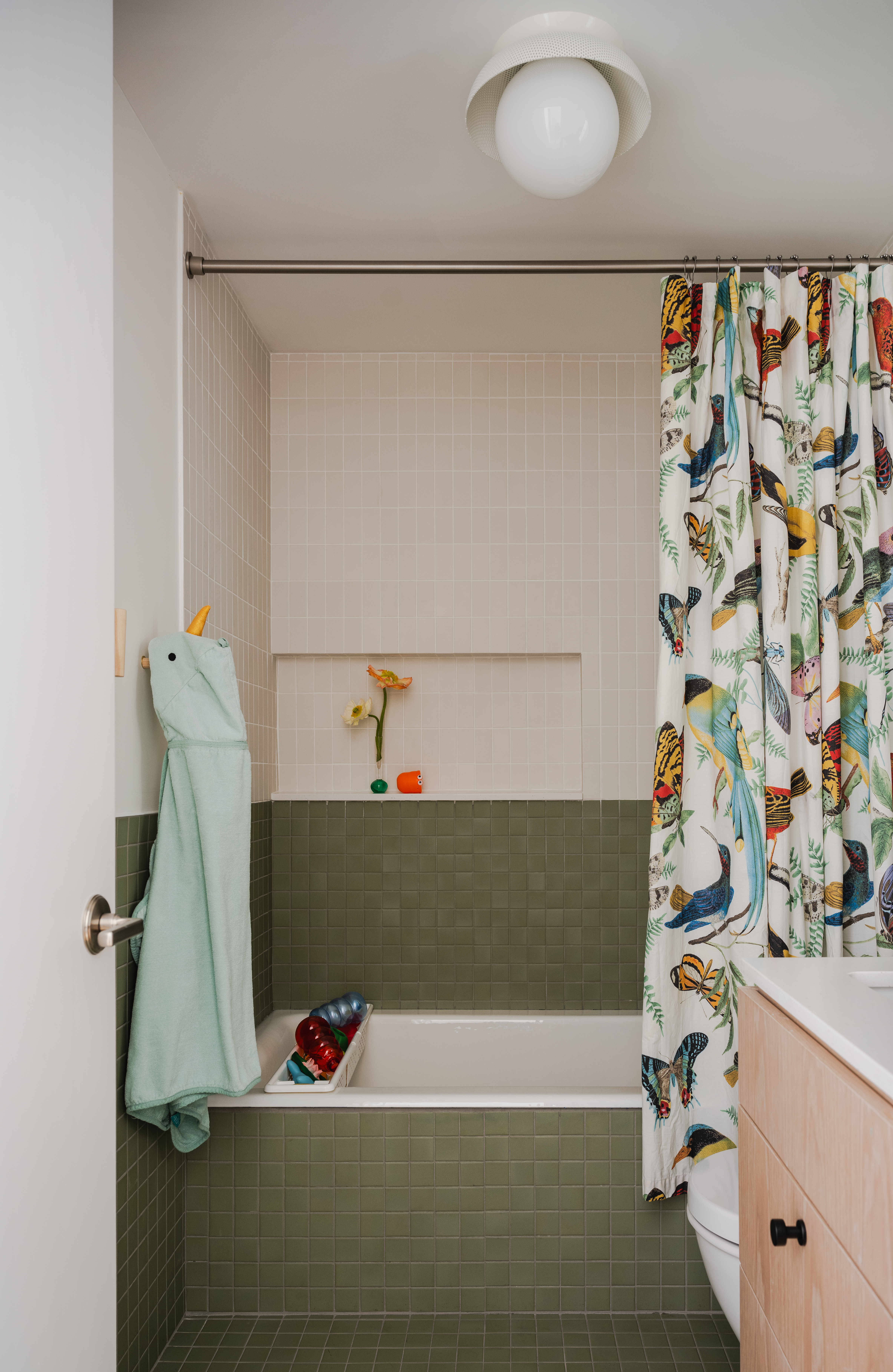 Green tile cladding the floor and running halfway up the wall in the kids’ bath was “a fun way to do a dual color scheme,” the architect said.