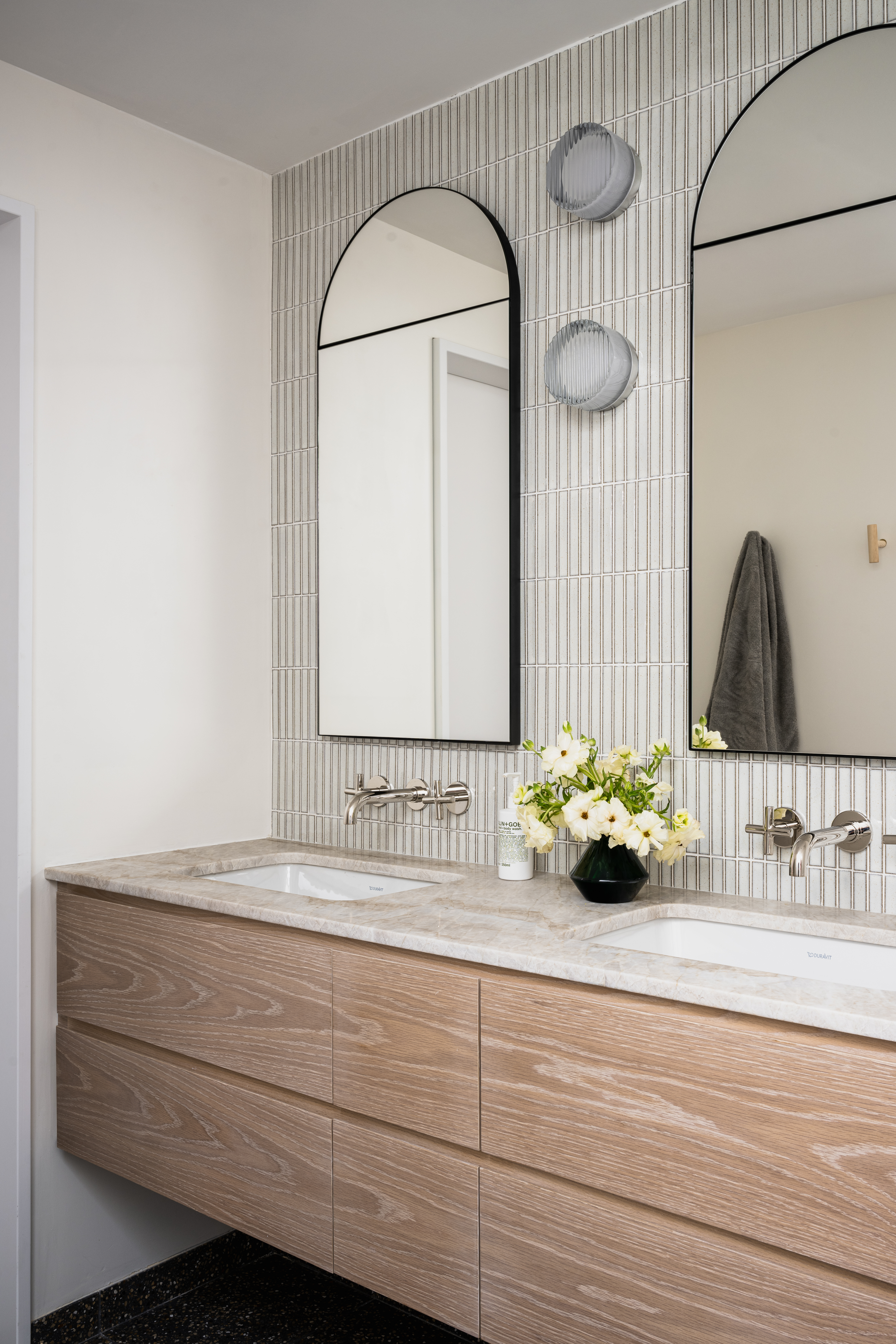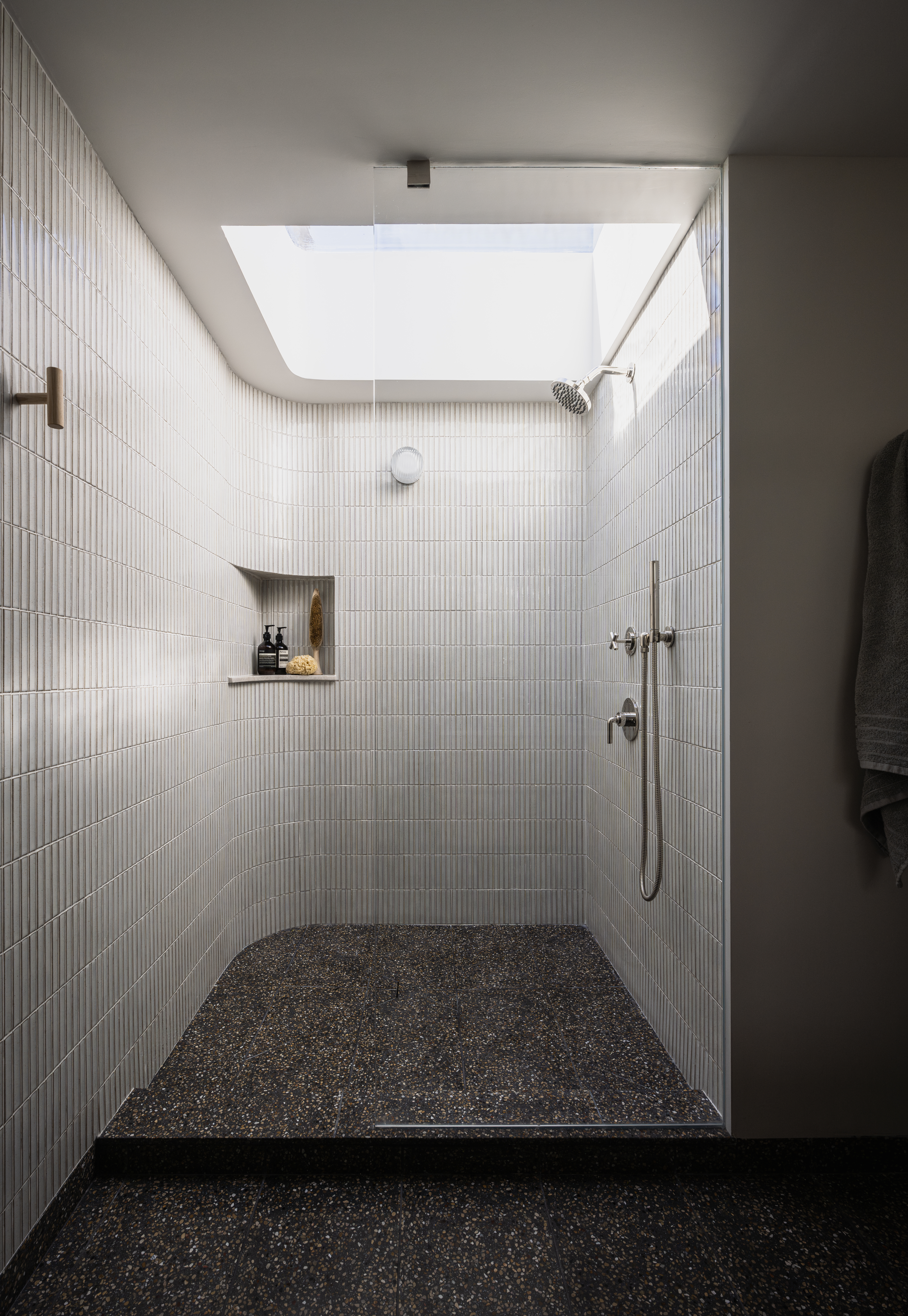 Coughlin Scheel added a skylight to enhance the primary bath, which stands out for its curved walk-in shower. “We found a mosaic tile from the Japanese company Inax that could turn that radius,” Scheel said. River rocks comprise the flooring material, sourced from Clé.