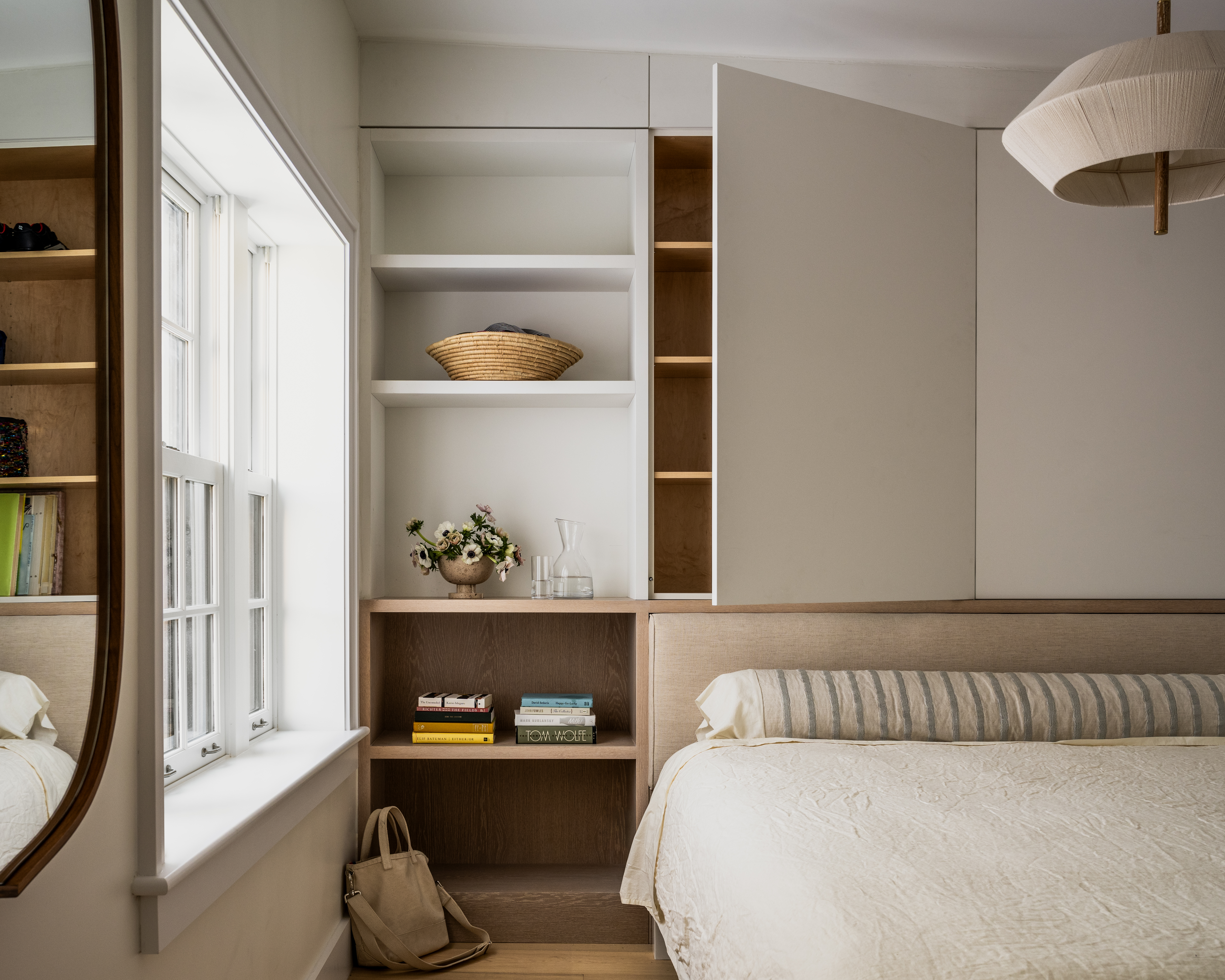 The top floor is dedicated to a primary suite, with an all-new bath, small office, and laundry area. Custom millwork in the bedroom includes an integrated headboard wall and abundant white oak storage, painted above and stained below.
