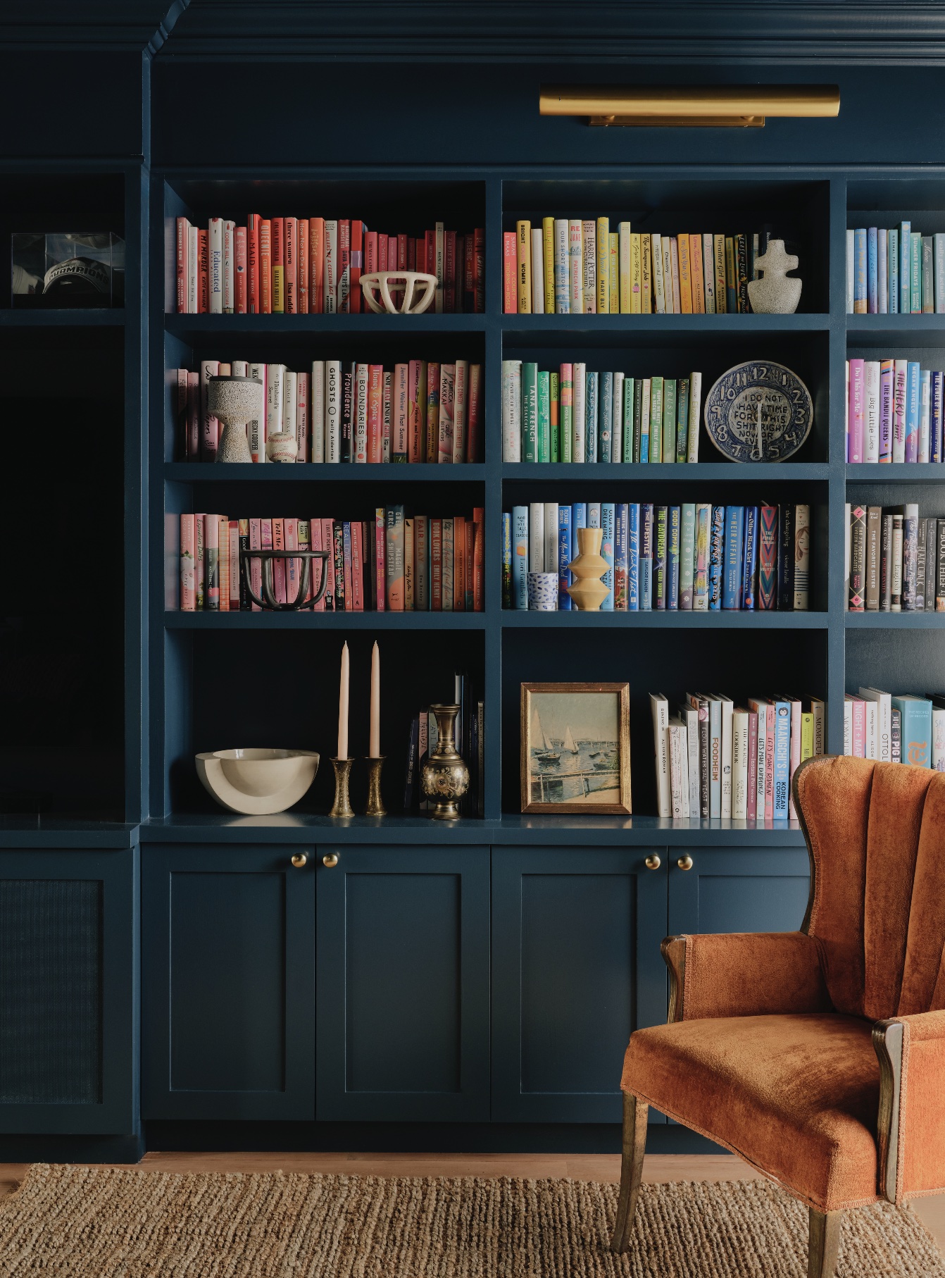 The library/media area in the center of the space is defined by a 14-foot-long custom book and TV unit designed by Glaser and painted Washington Blue, a deep navy by Benjamin Moore, along with a small bar and kitchenette.