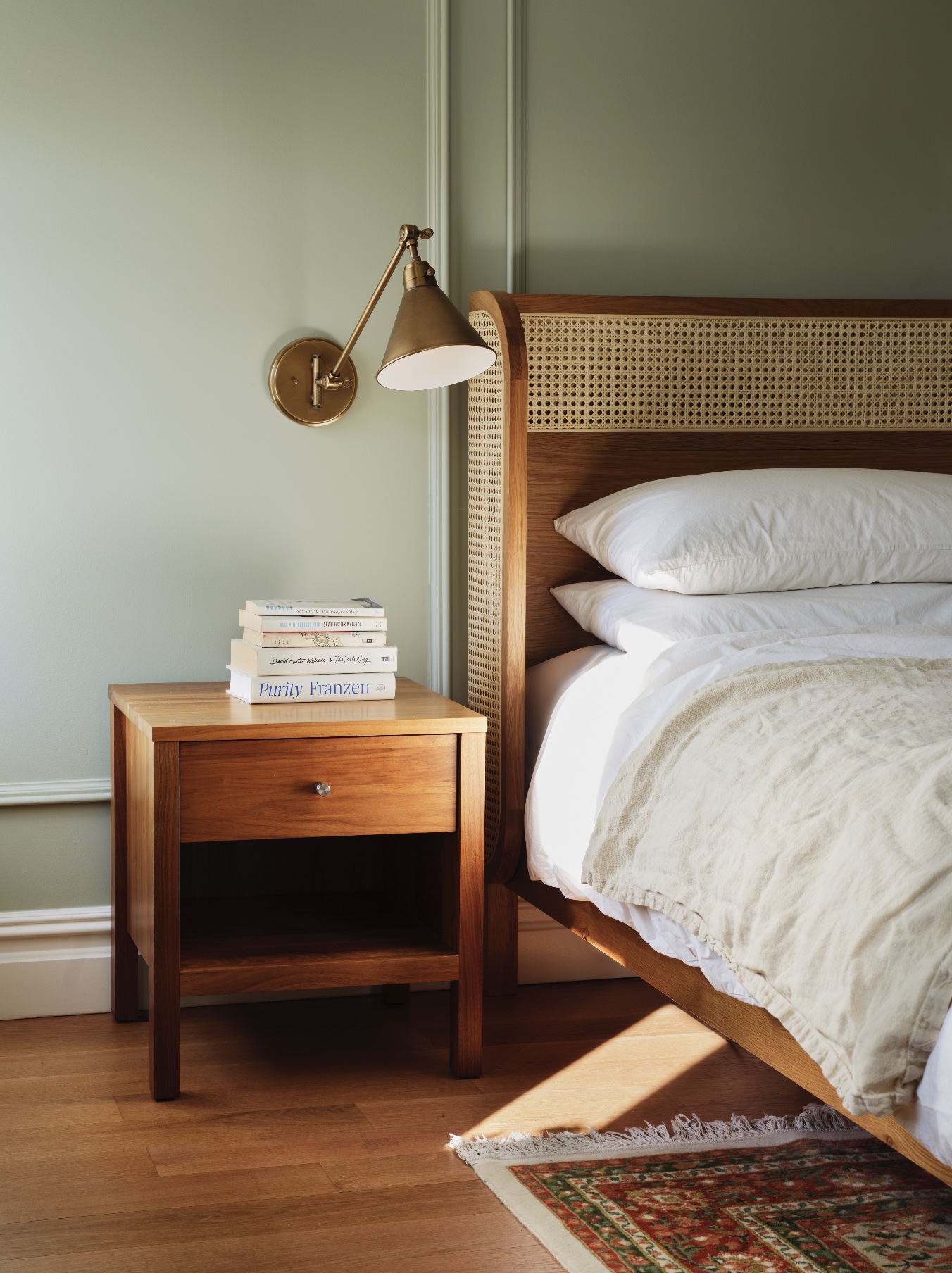 “Cozy and calm, with good lighting” was the aim for the primary bedroom, painted Grecian Green by Benjamin Moore. A caned headboard from Article, an online outlet, brings the coastal vibe.