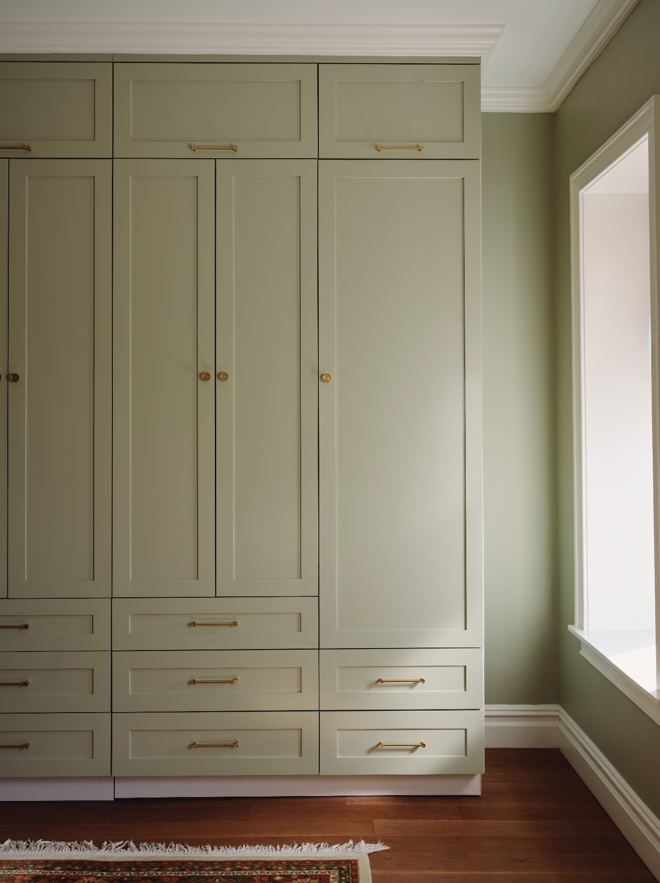 A new wall of closets was fashioned out of semi-custom IKEA boxes with fronts made by the millworker.