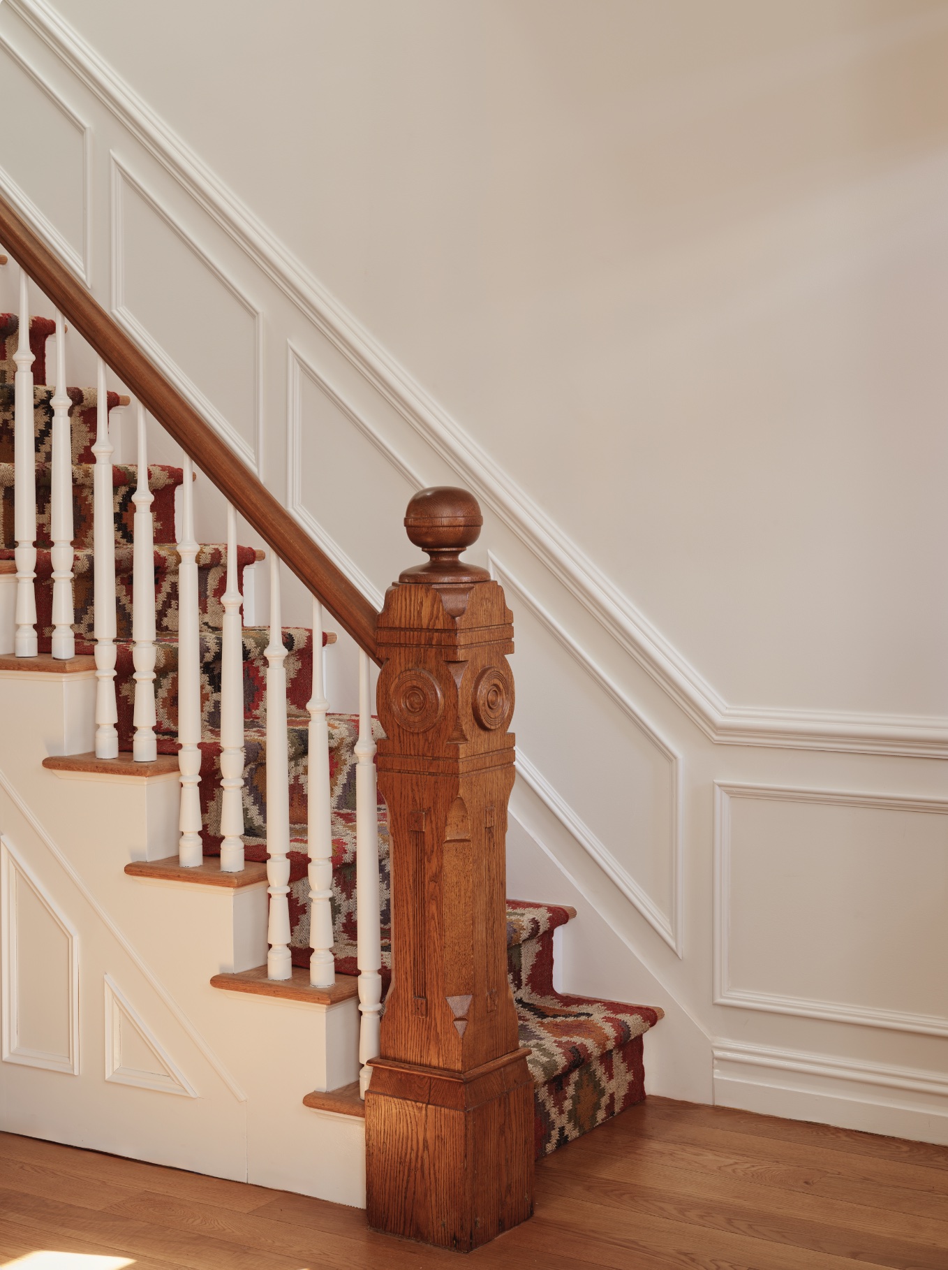 A newel post sourced from Etsy replaced one made of “nailed-together 1x4s,” Glaser said. The stairs were in sound shape overall, with decent balusters and handrails. Glam Studio added wall moldings along the side of the staircase and the wall going upstairs, as well as runner carpet, also from Etsy.