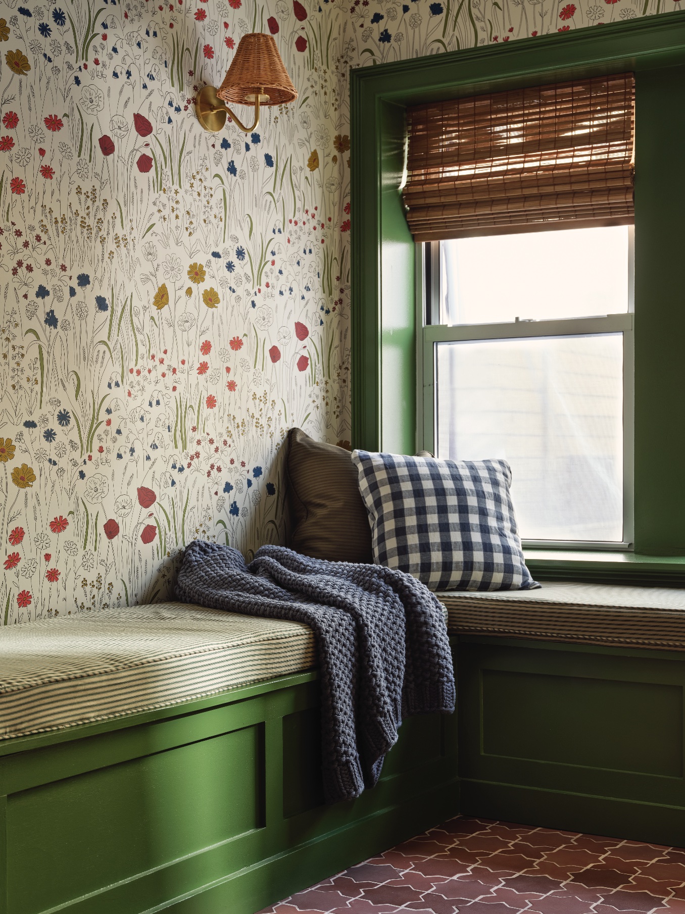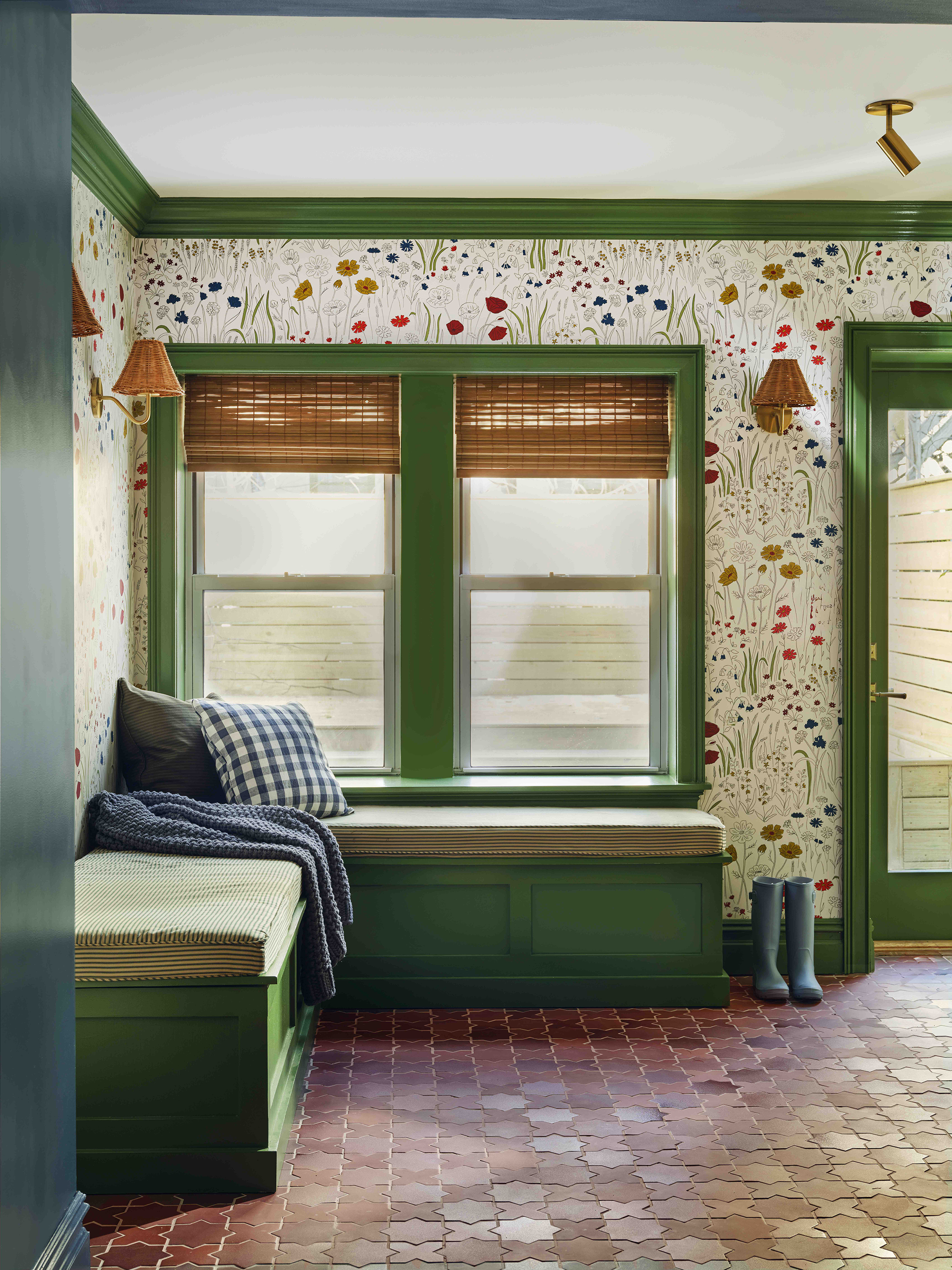 At the rear, a green sunroom painted Herb Garden by Benjamin Moore, with Alpine Garden wallpaper from Hygge & West, Fireclay floor tile, and an L-shaped window seat, overlooks the garden.