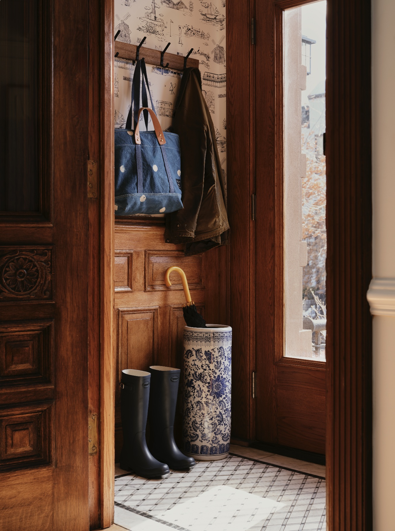 The entry vestibule was the one area where original woodwork, not even in need of refinishing, remained. “It was the most untouched space,” Glaser said. Hamptons Toile wallpaper from Katie Kime introduces the fun wallpaper theme.