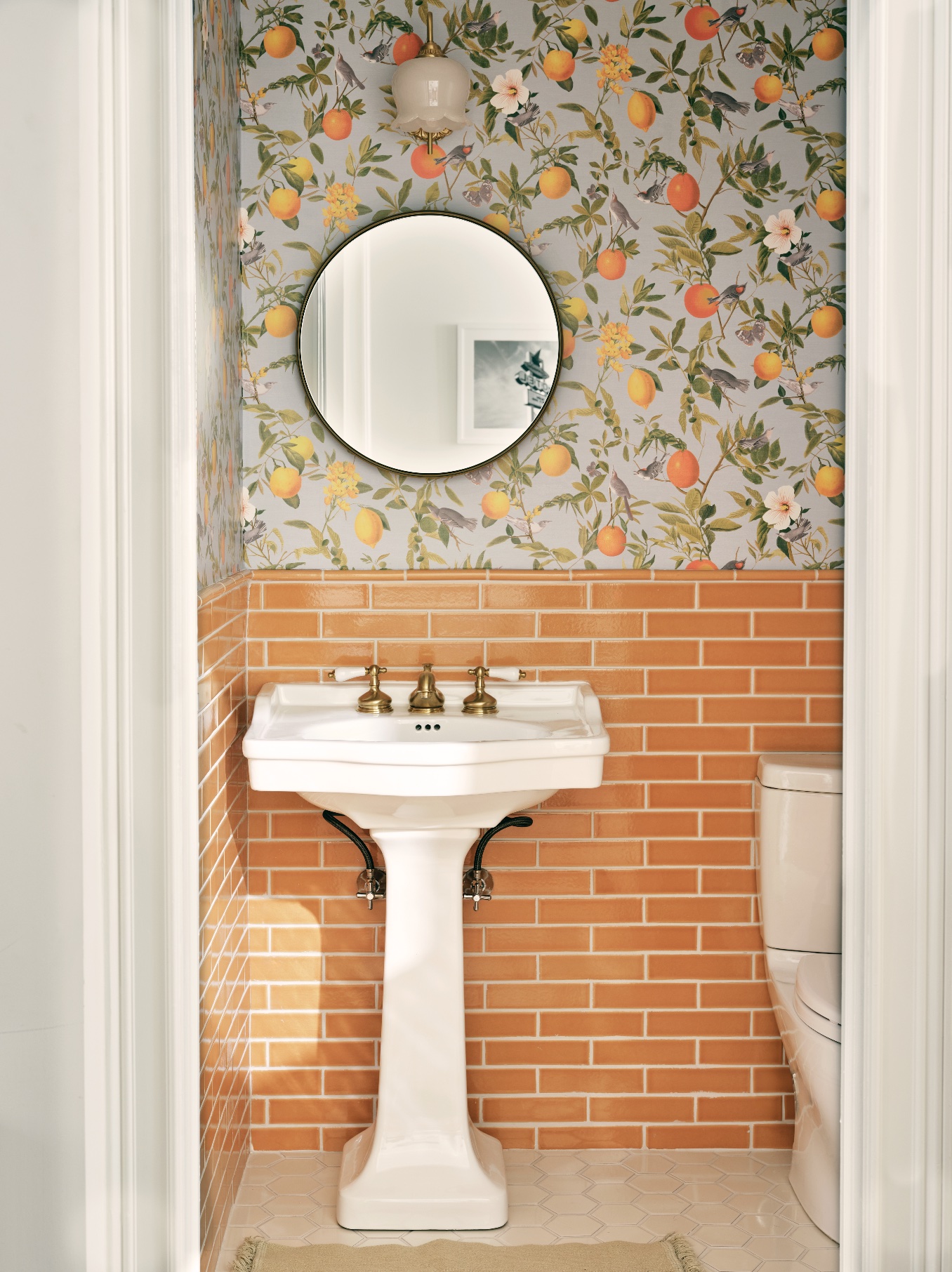 A powder room with Fireclay wall and floor tile and a pedestal sink from Vintage Tub & Bath was inspired by the clients’ recent trip to Italy, Ament said. “They came back with a desire to use orange and lemon wallpaper,” found at Home Depot.