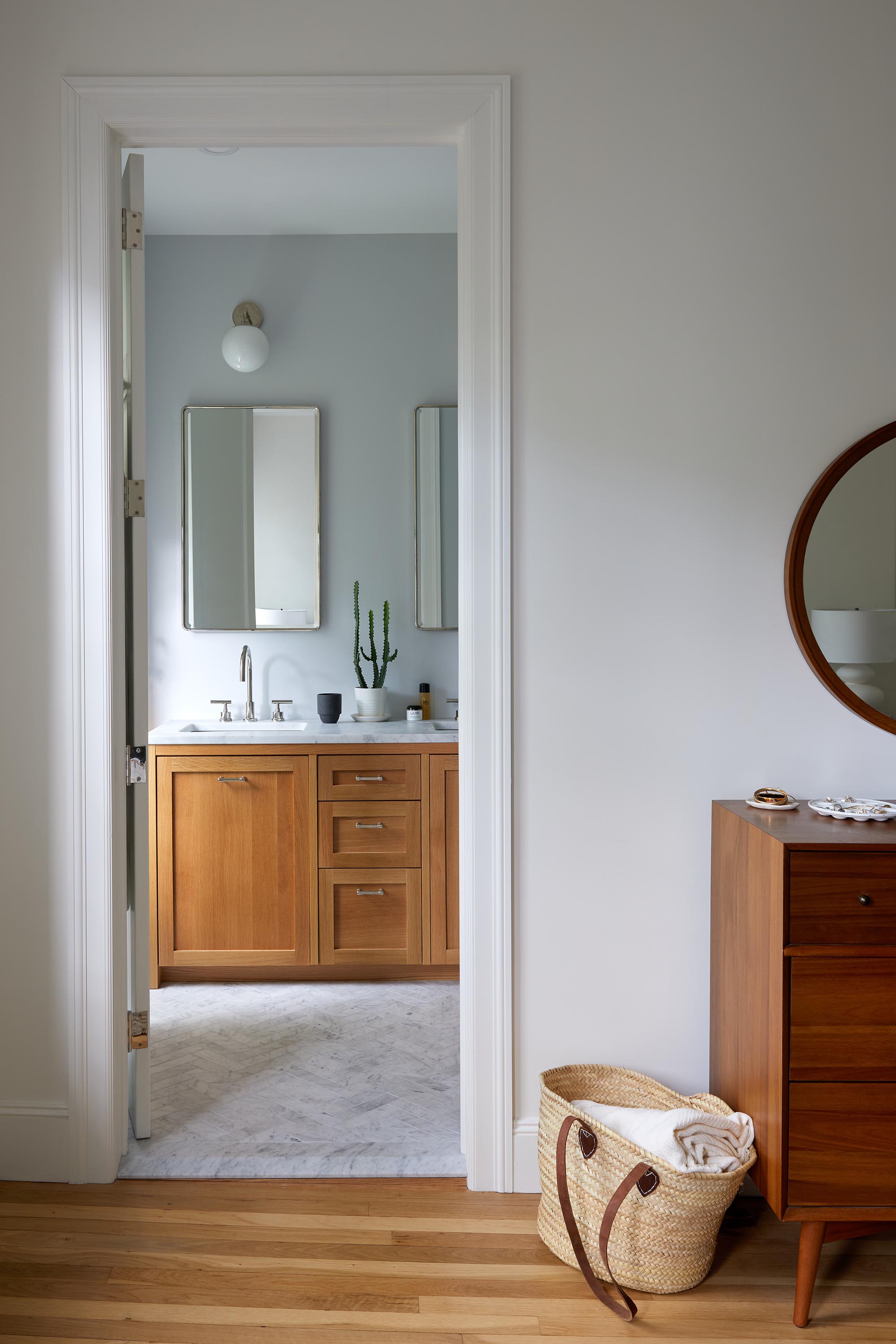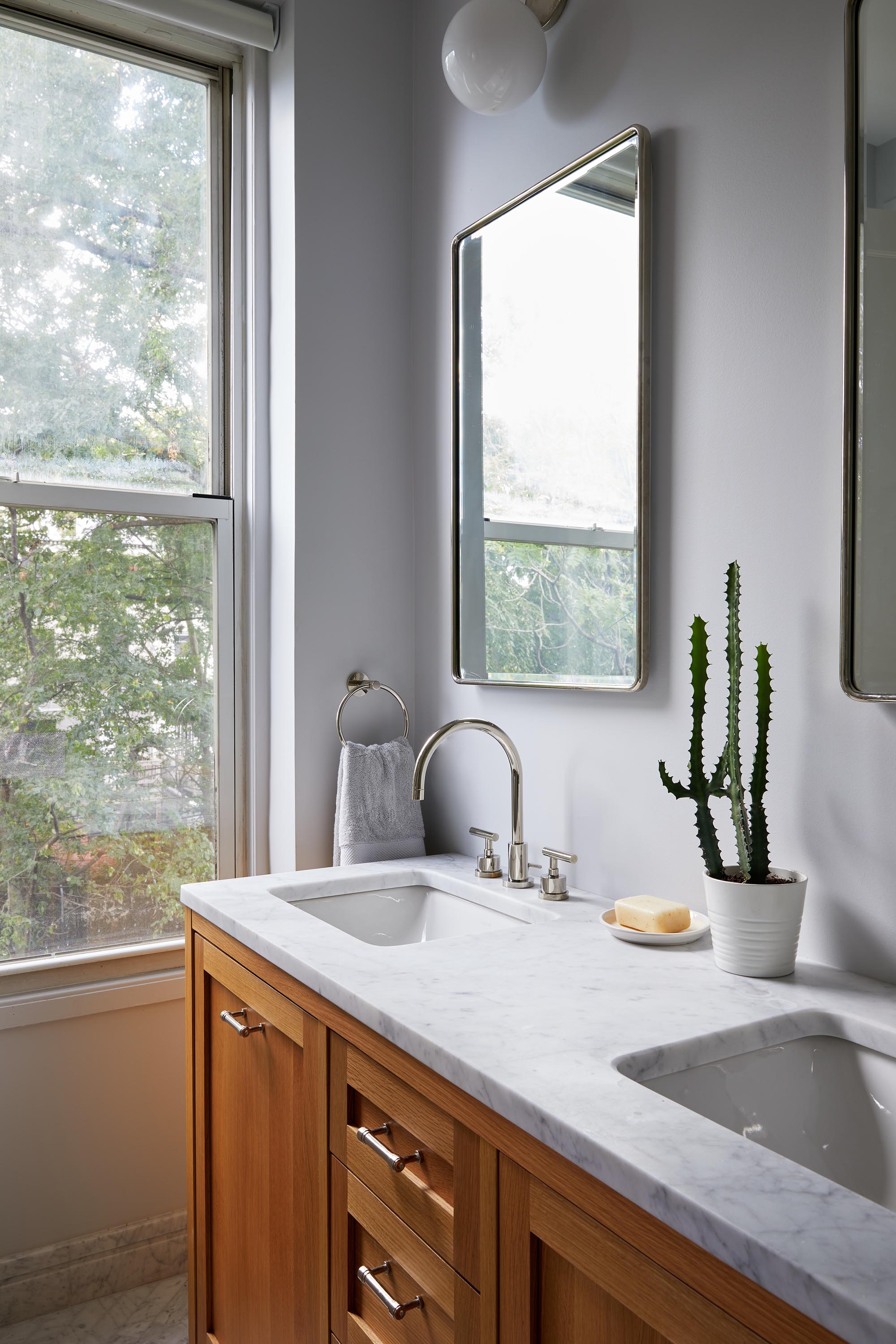 The Carrara marble top on the custom oak vanity in the primary bath was salvaged from a restaurant about to be demolished. “It had been on a bar and had this timeworn look,” Otten recalled. “We honed it and cleaned it up and reused it.” It closely matches the marble used in the kitchen downstairs.