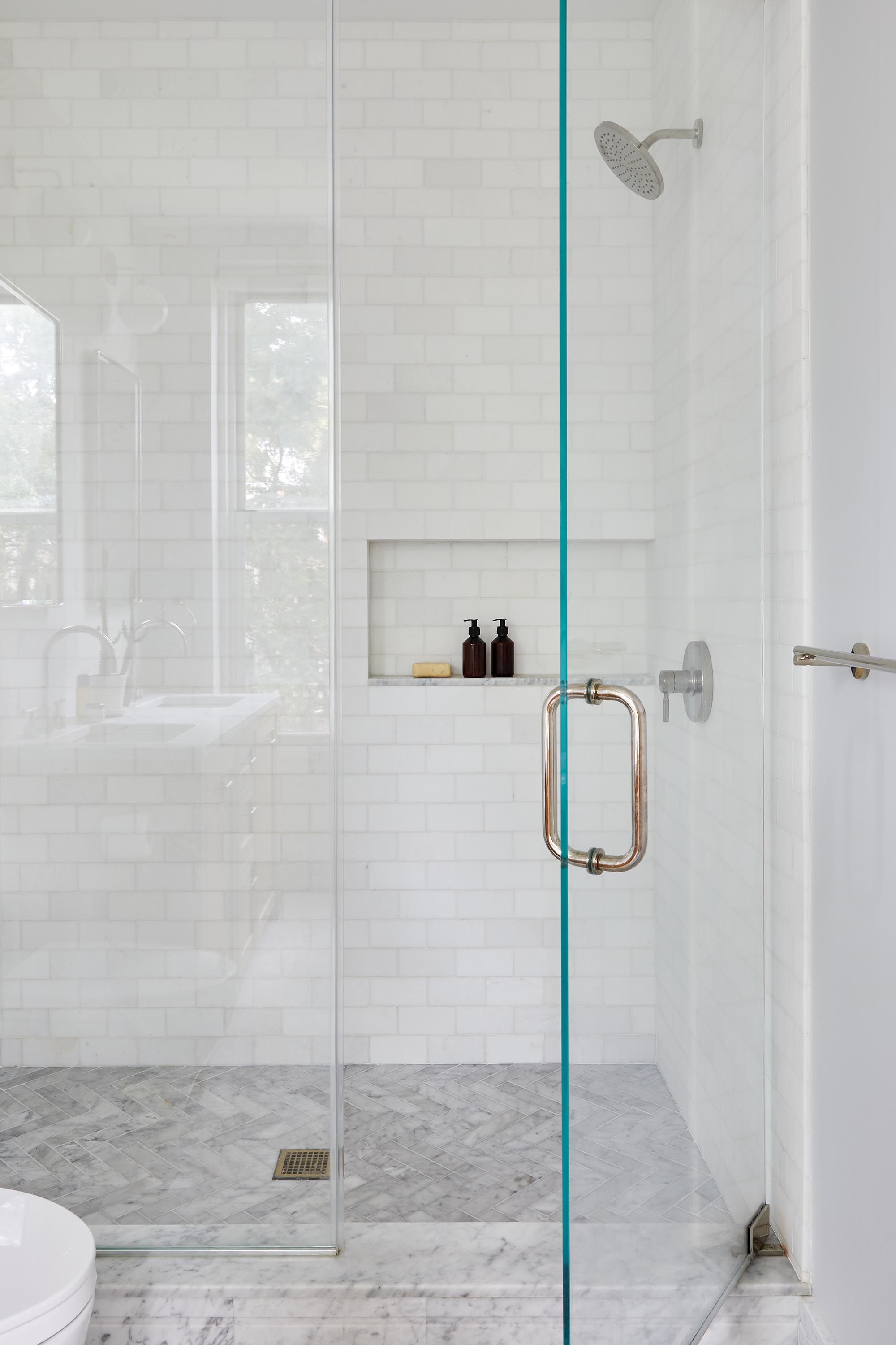 The shower, floor, and even the baseboard molding are Carrara marble as well, the floor formed of tiles laid in a herringbone pattern.