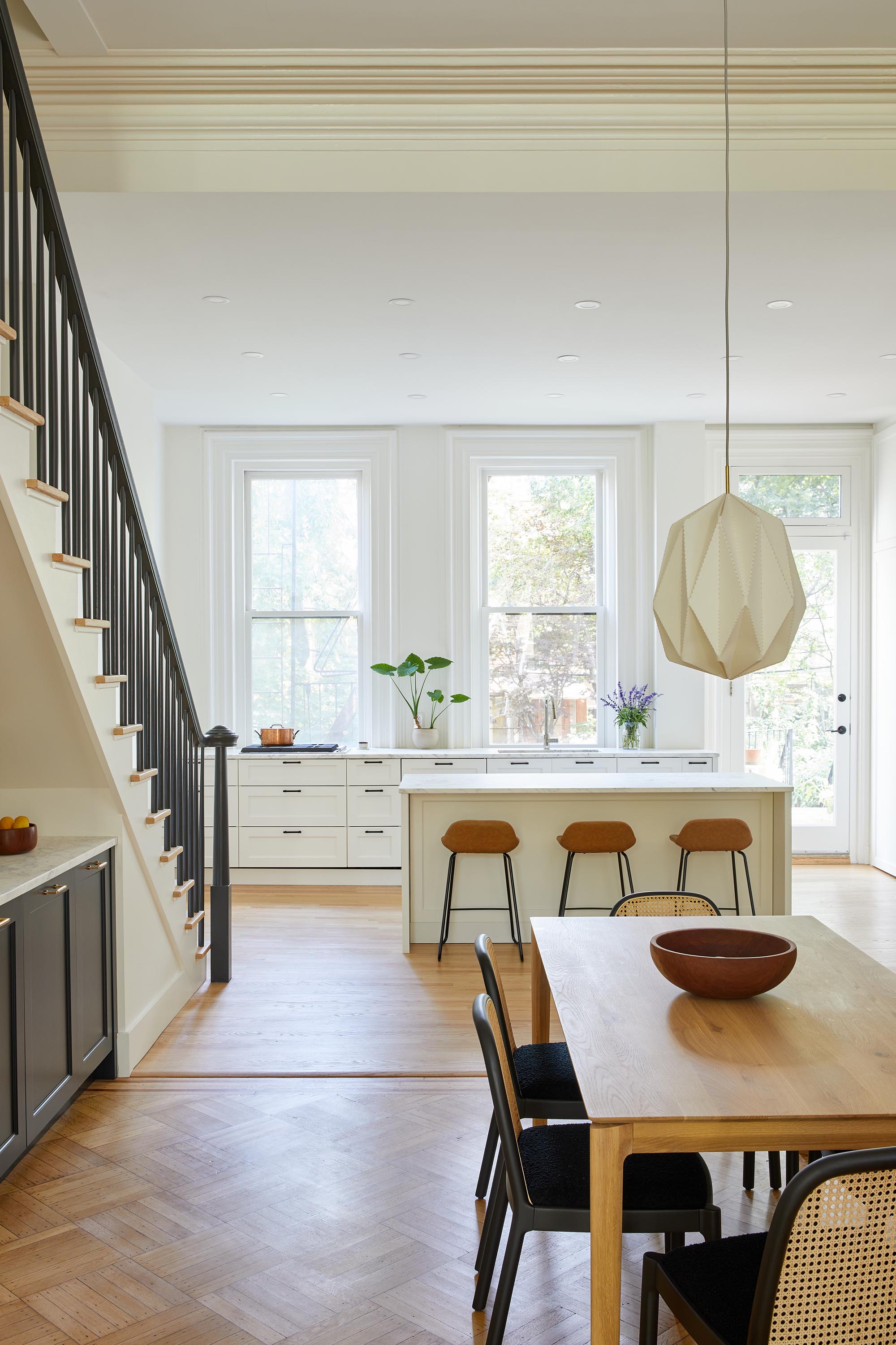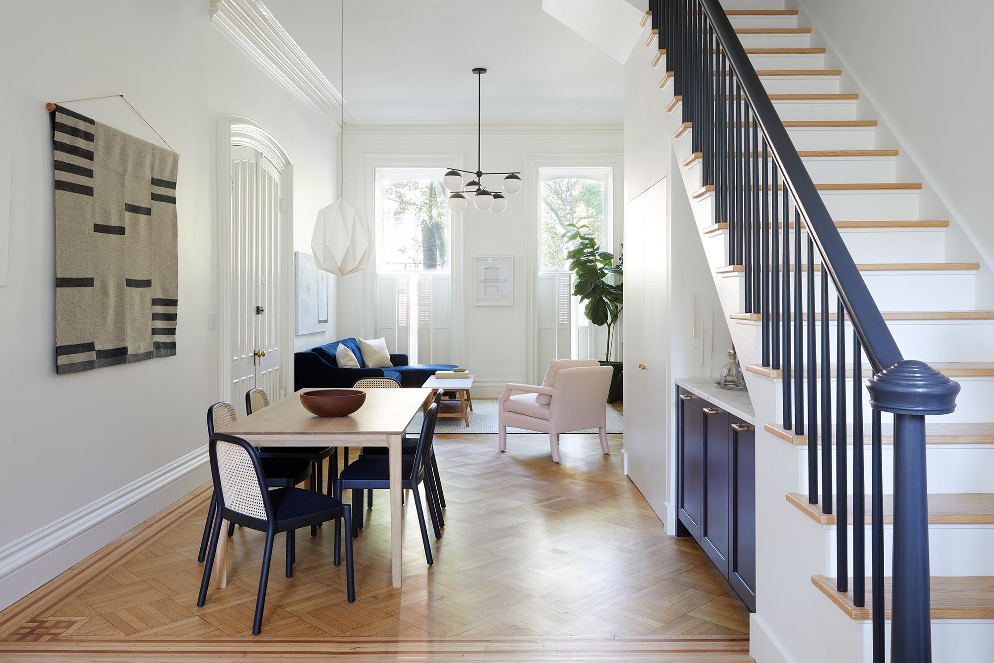 When a young couple purchased the parlor and second levels in a five-story row house condo, planning to start and raise a family there, the two floors were connected by a less-than-ideal spiral stair. “They wanted a proper stair that felt more like townhouse living, and the kitchen was in the back and cut off from everything,” said architect Margot Otten of Brooklyn- and Hoboken-based OSSO Architecture, which carried out what she called “a pretty big overhaul” of the duplex space.