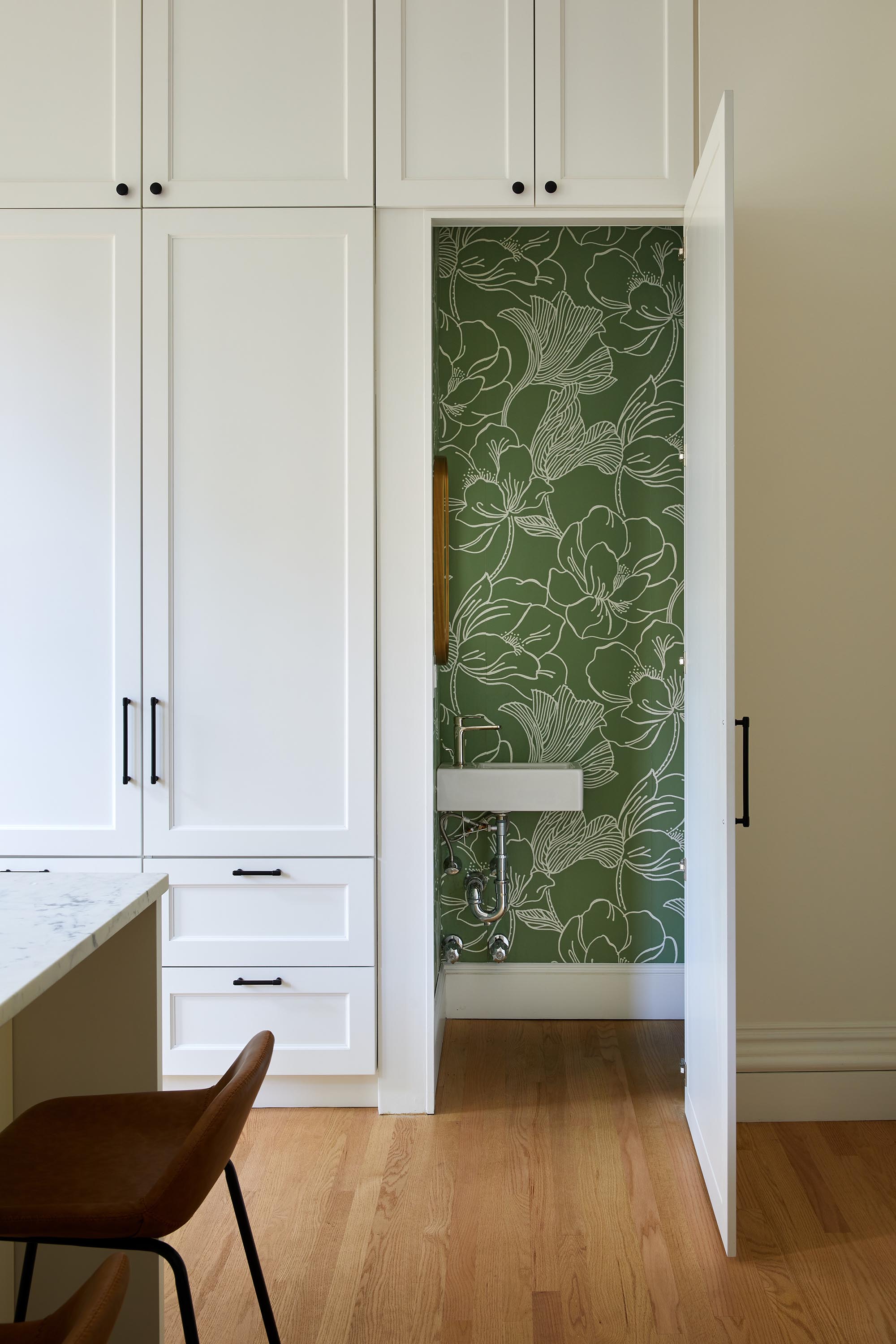 Ikea cabinets in the kitchen, with custom fronts, helped keep the budget in check. “We were able to get a lot of storage in there for what we spent,” Segulja said. “Keeping the room open and concealing a fridge, laundry, and powder room behind tall cabinet doors feels very chic, and allowed us to maintain the existing windows and view to the backyard.”
