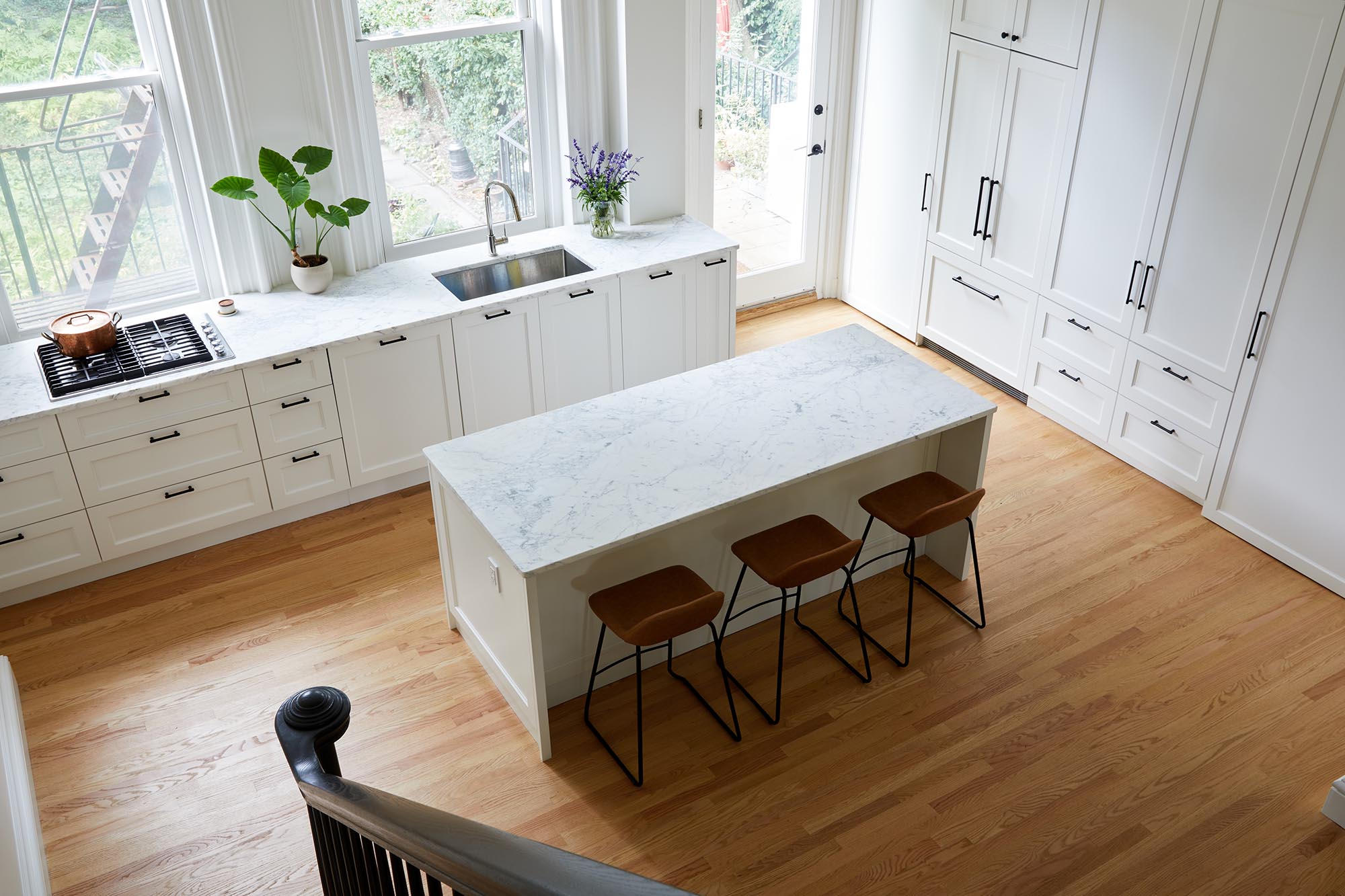 With refreshing clarity and using a nearly all-white palette, OSSO Architecture designed a new staircase and an open kitchen, and reworked the layout on the upper floor to fit in as many beds and baths as possible. Central air replaced window AC units, and slim European-style baseboard radiators took the place of some of the old-fashioned cast iron ones.