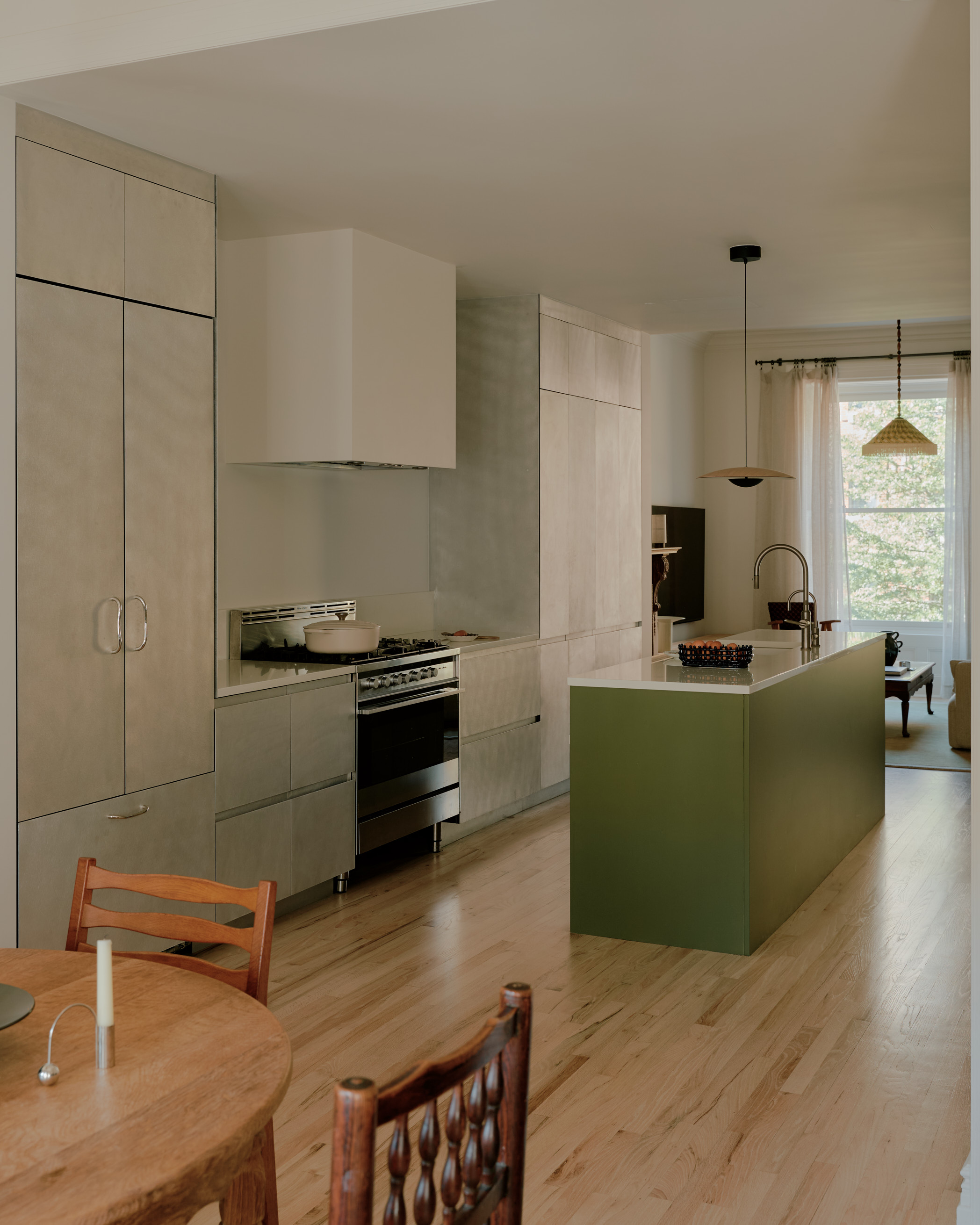 One enters the kitchen immediately upon coming into the apartment. As such, Lee said, “We wanted it to be clean and quiet, with simple lines, so it doesn’t feel like an obstruction in the middle and speaks to both zones,” the living and dining rooms on either side.