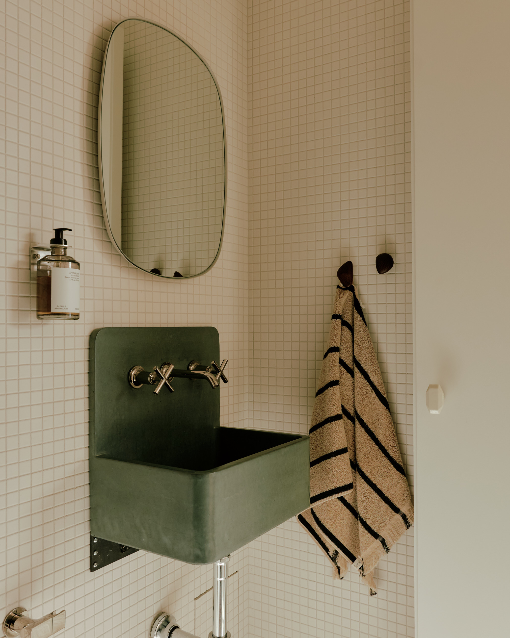 A new powder room on the lower level sports off-white mosaic tile, a mirror from Muuto, and a bold green concrete sink.