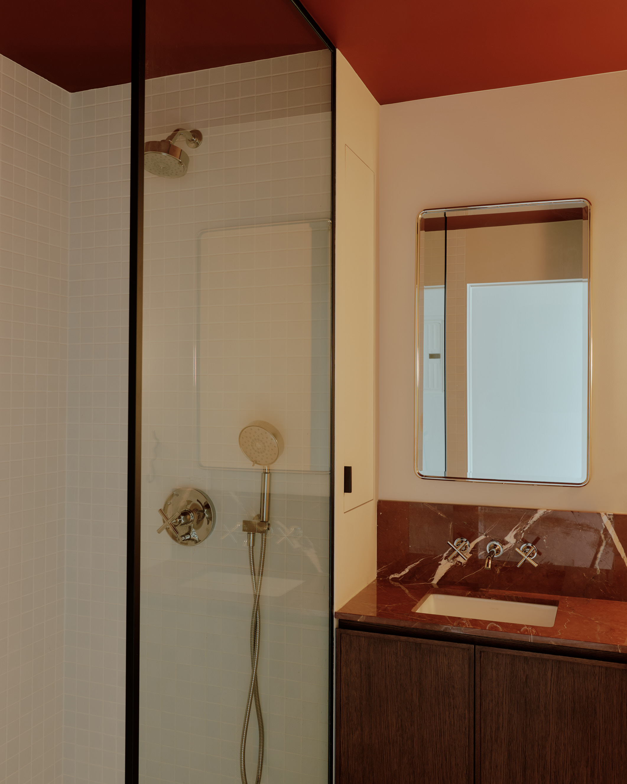 Bespoke Only reduced the bedroom’s footprint slightly to accommodate the new bath. “Because the wooden enclosure is part of the room, it doesn’t feel like the room got much smaller,” Lee said.