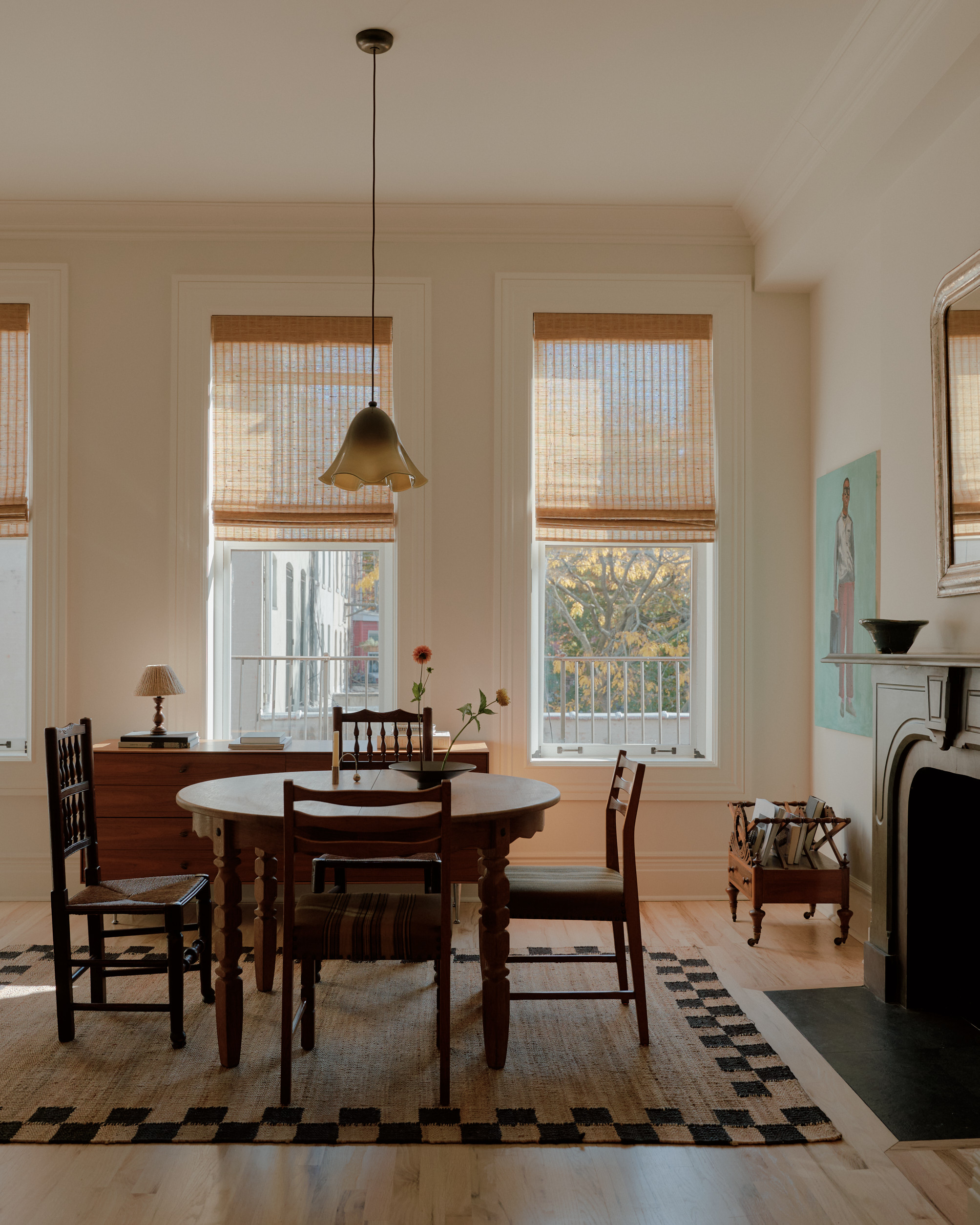The dining room is “simple, modest and homey,” Lee said, with a vintage gate leg table accompanied by rush-seated and mid-century chairs, a glass pendant from In Common With, jute rug from Nordic Knots, and wood window shades. The carved magazine rack is an antique rosewood piece; the home office area, with a tubular steel chair, throughly modernist.