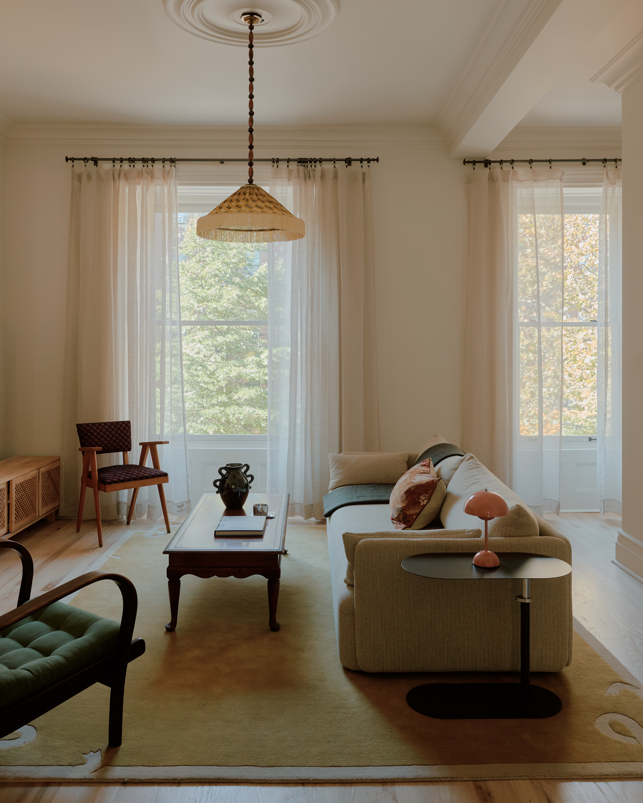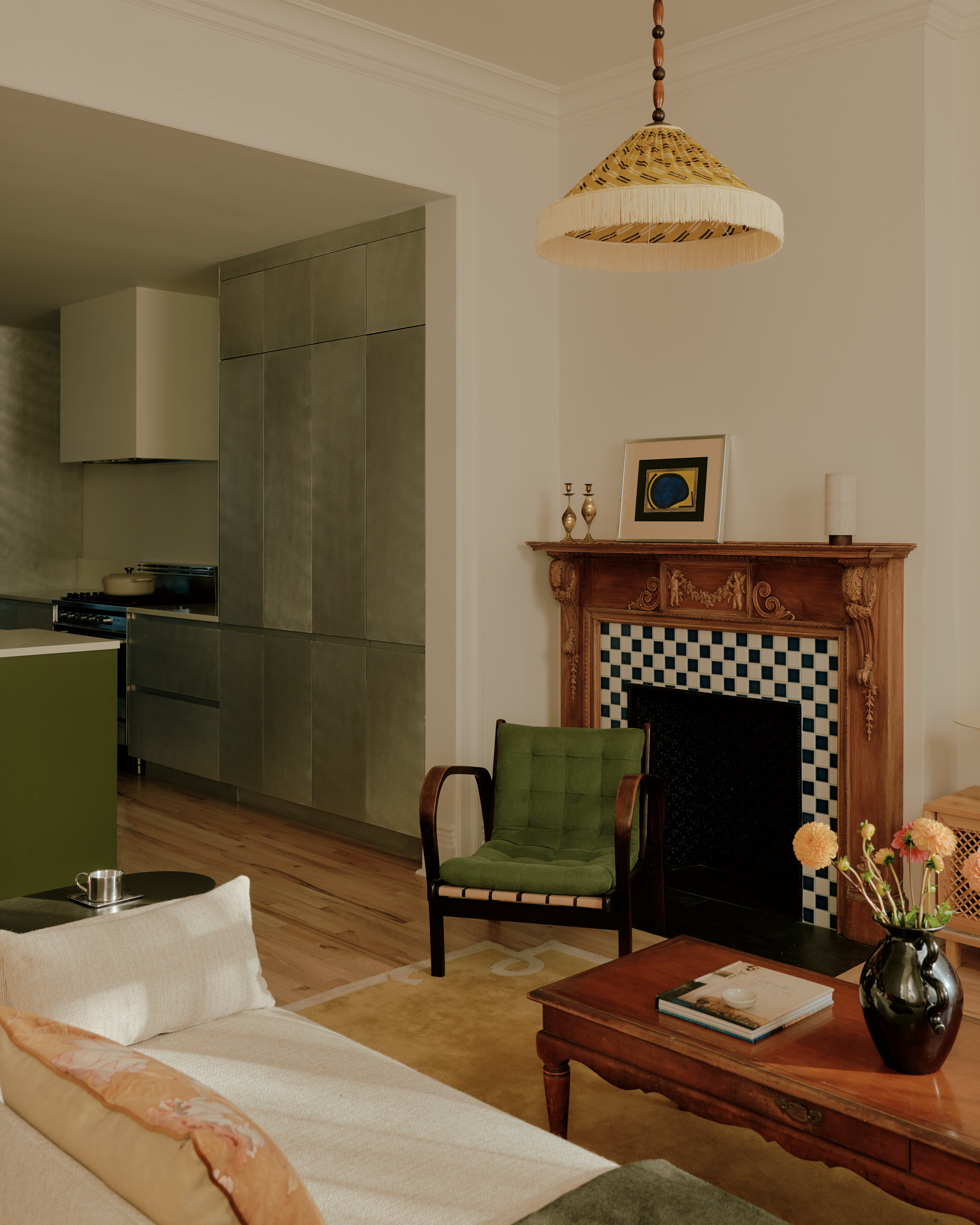 Living room furnishings are a mix of vintage and new. There’s a contemporary sofa from the Scandinavian brand Audo, vintage armchairs, a Chippendale-style coffee table, a rug from Nordic Knots, and a 1940s Austrian pendant fixture Lee finds reminiscent of 19th century Shanghai.