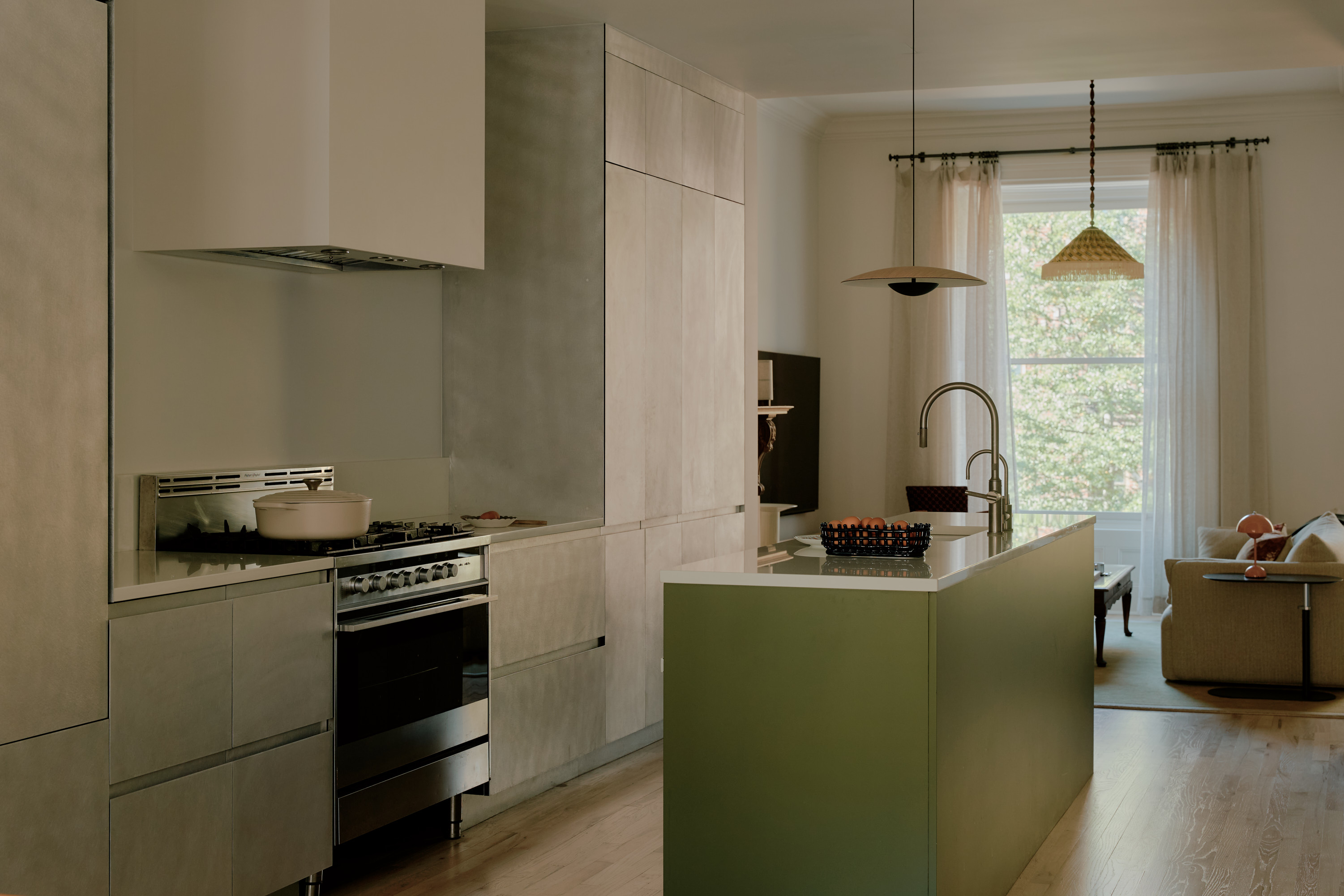 Cabinetry from Reform with fronts of brushed stainless steel, a pale green custom island of painted wood, and a minimalist pendant light fit the bill.