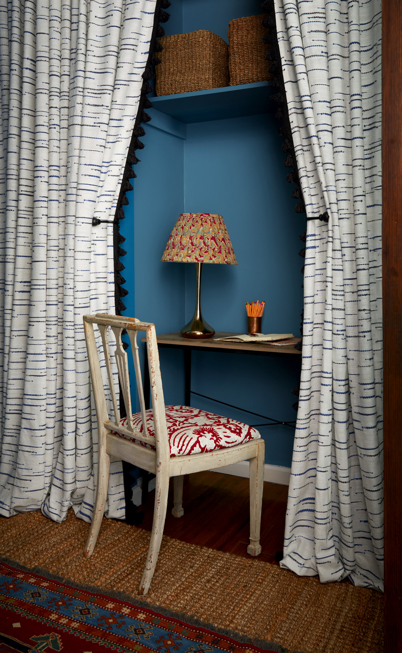 The guest room/study “gets zero sunlight,” the designer said. She embraced that limitation by painting the walls Deep Ocean from Benjamin Moore, and enveloping a work-from-home nook in floor-to-ceiling drapes.