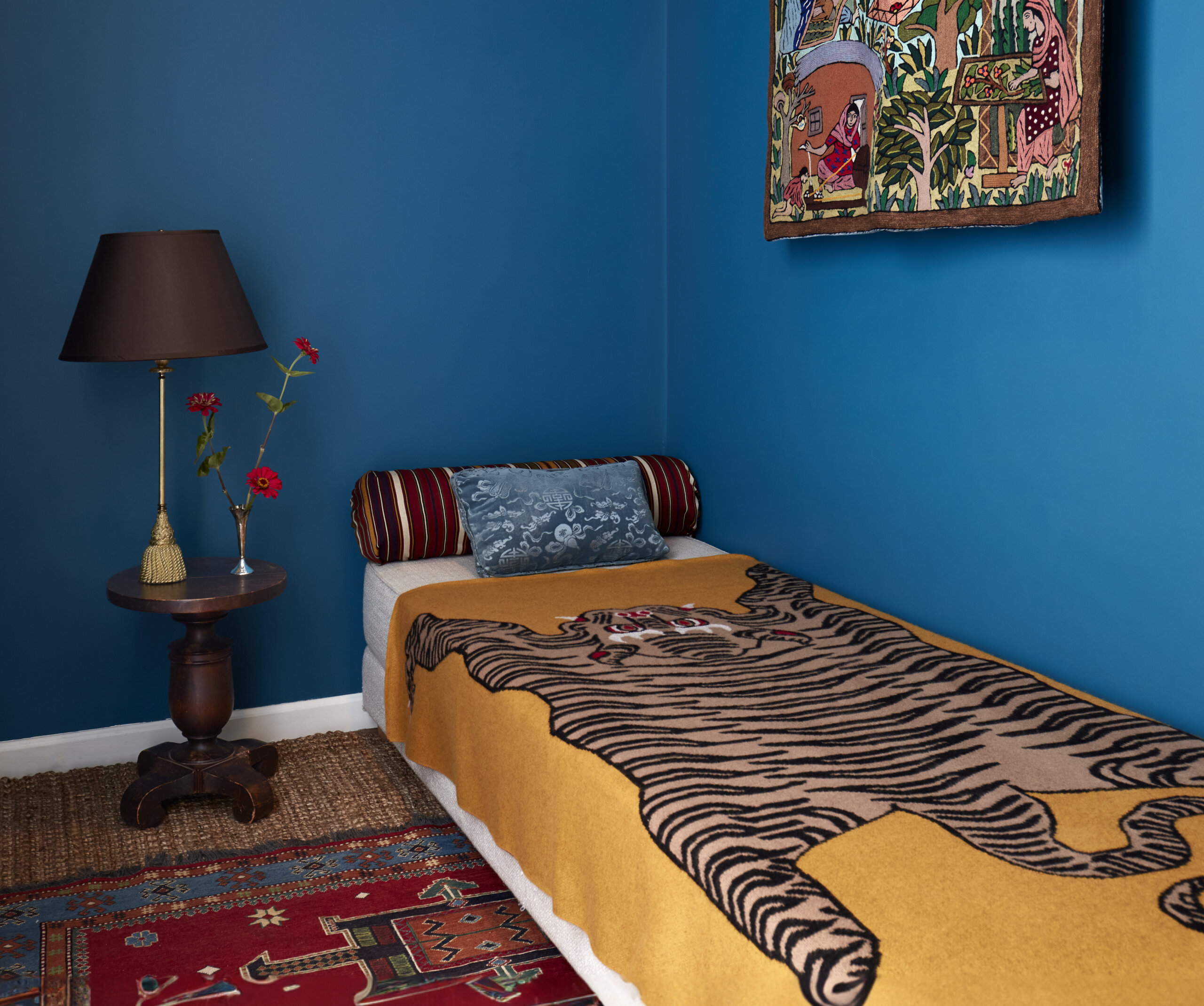 The client brought the rug and wall hanging back from Pakistan. The daybed, from CB2, opens to a full-size bed.