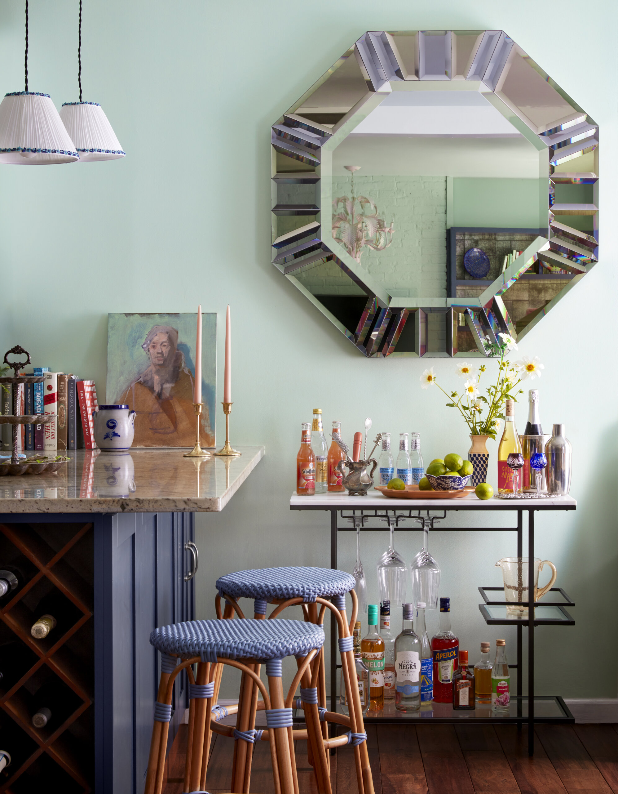 An impressive mirror from Furnish Green in Chelsea distinguishes a bar area near the kitchen.