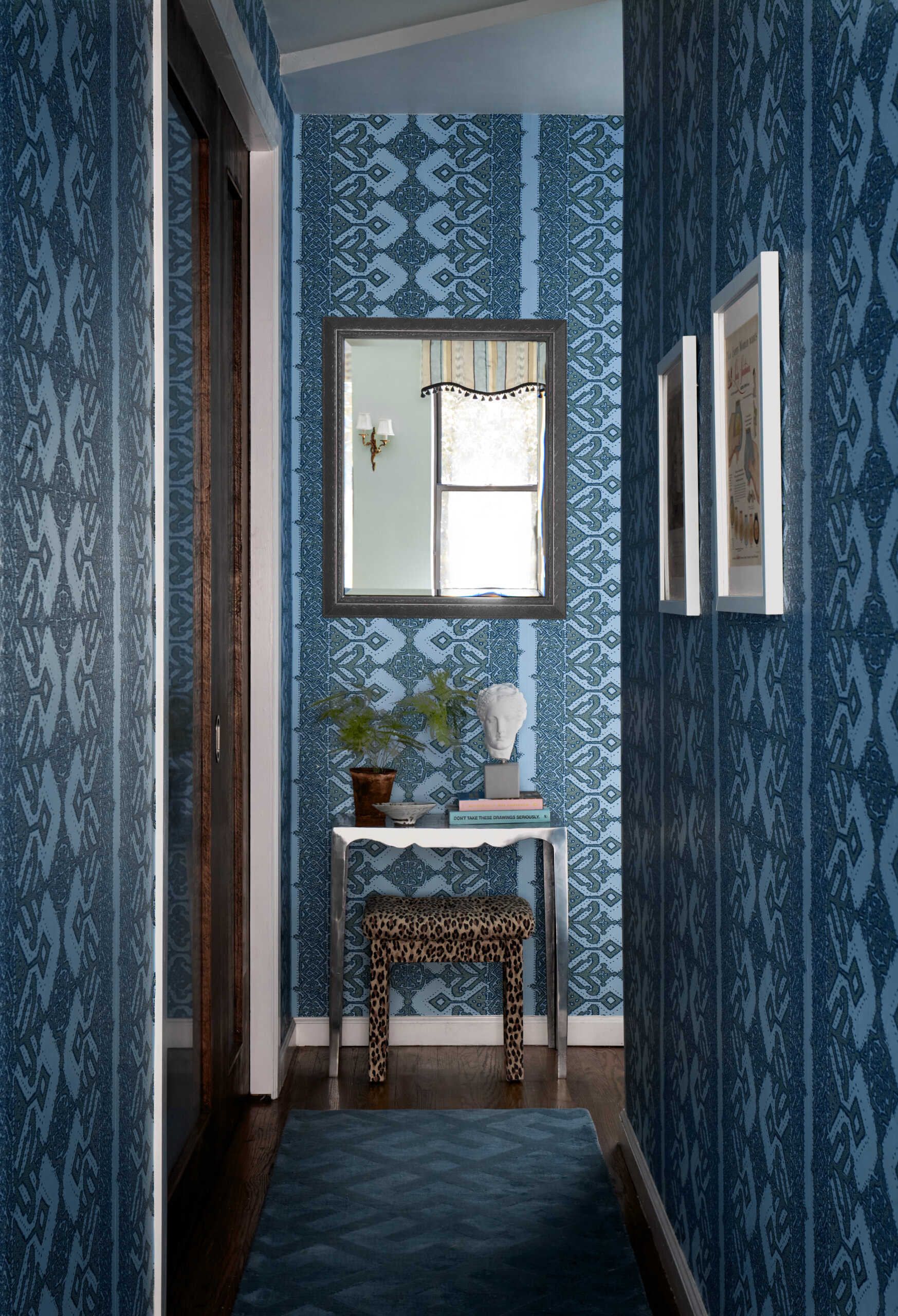 Blue and green wallpaper from Hygge & West, inspired by Portuguese azulejo tiles, “carries you down the hall” from the living room to the guest bedroom/office, McCauley said. The runner was sourced from ABC Carpet.