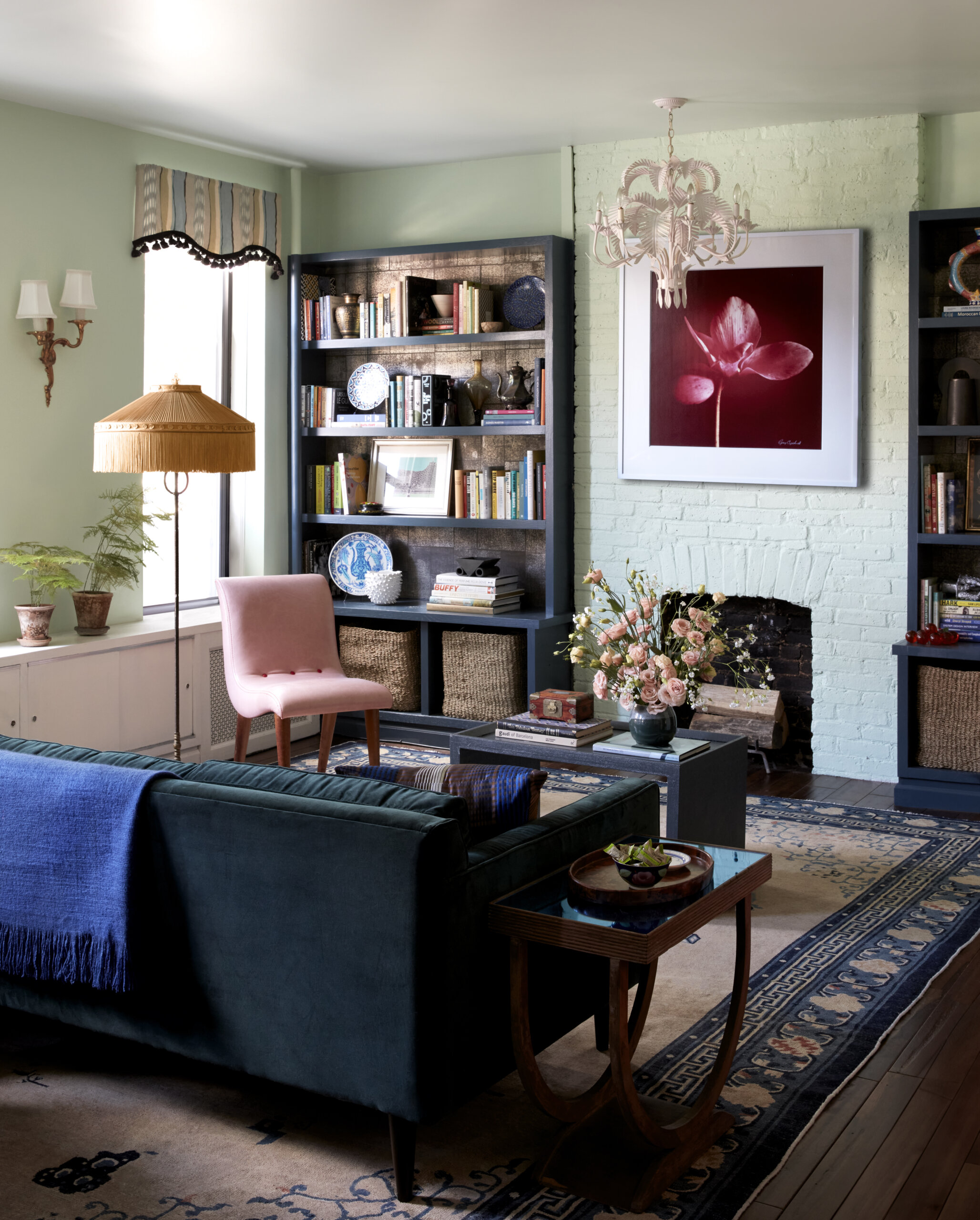 Since the living room, dining room and kitchen are one open area, the designer said, “I wanted it to feel cohesive from one end to the other. We painted the built-in bookcases the same blue as the kitchen cabinets, and used a rug with blue in it to tie the space together.”