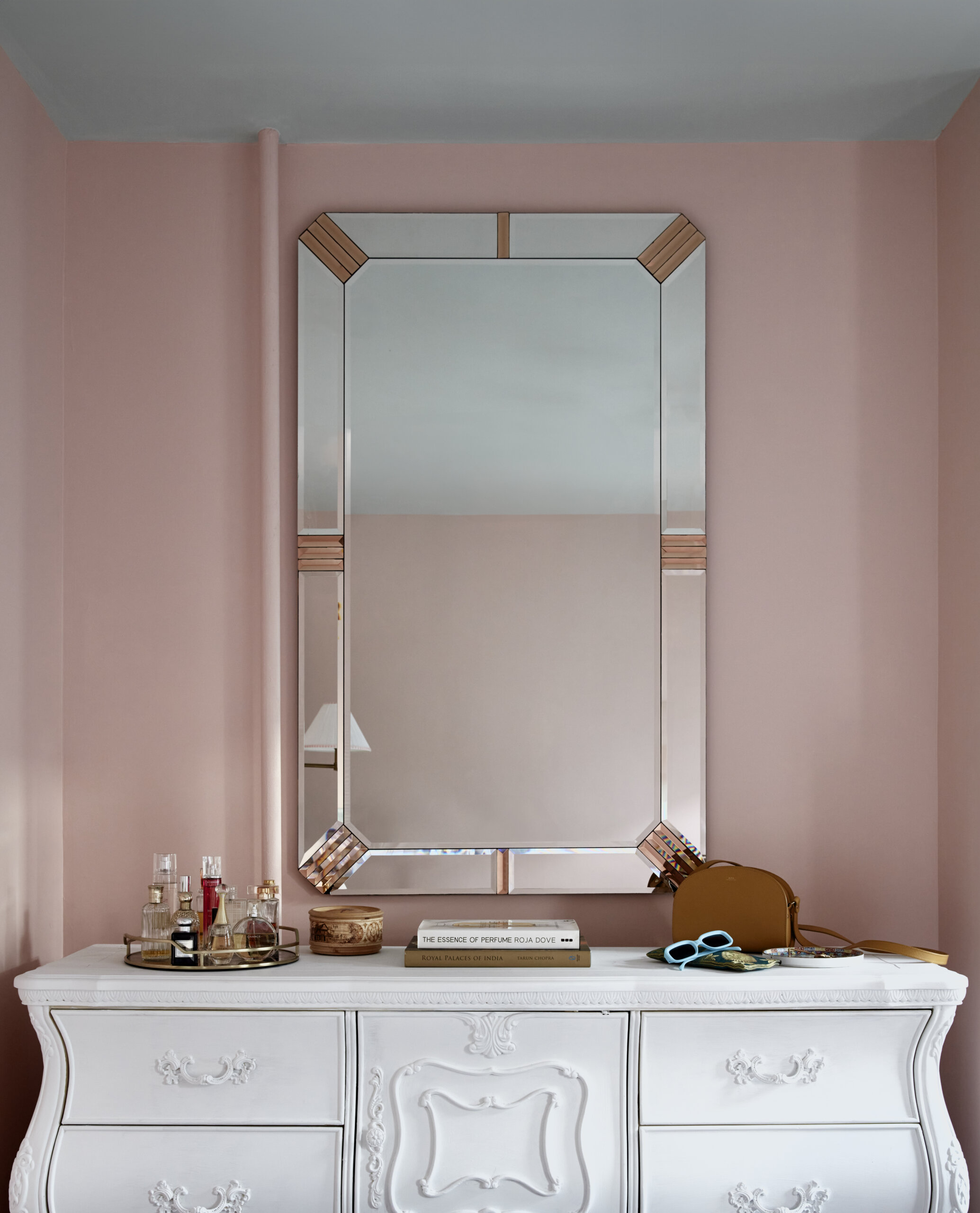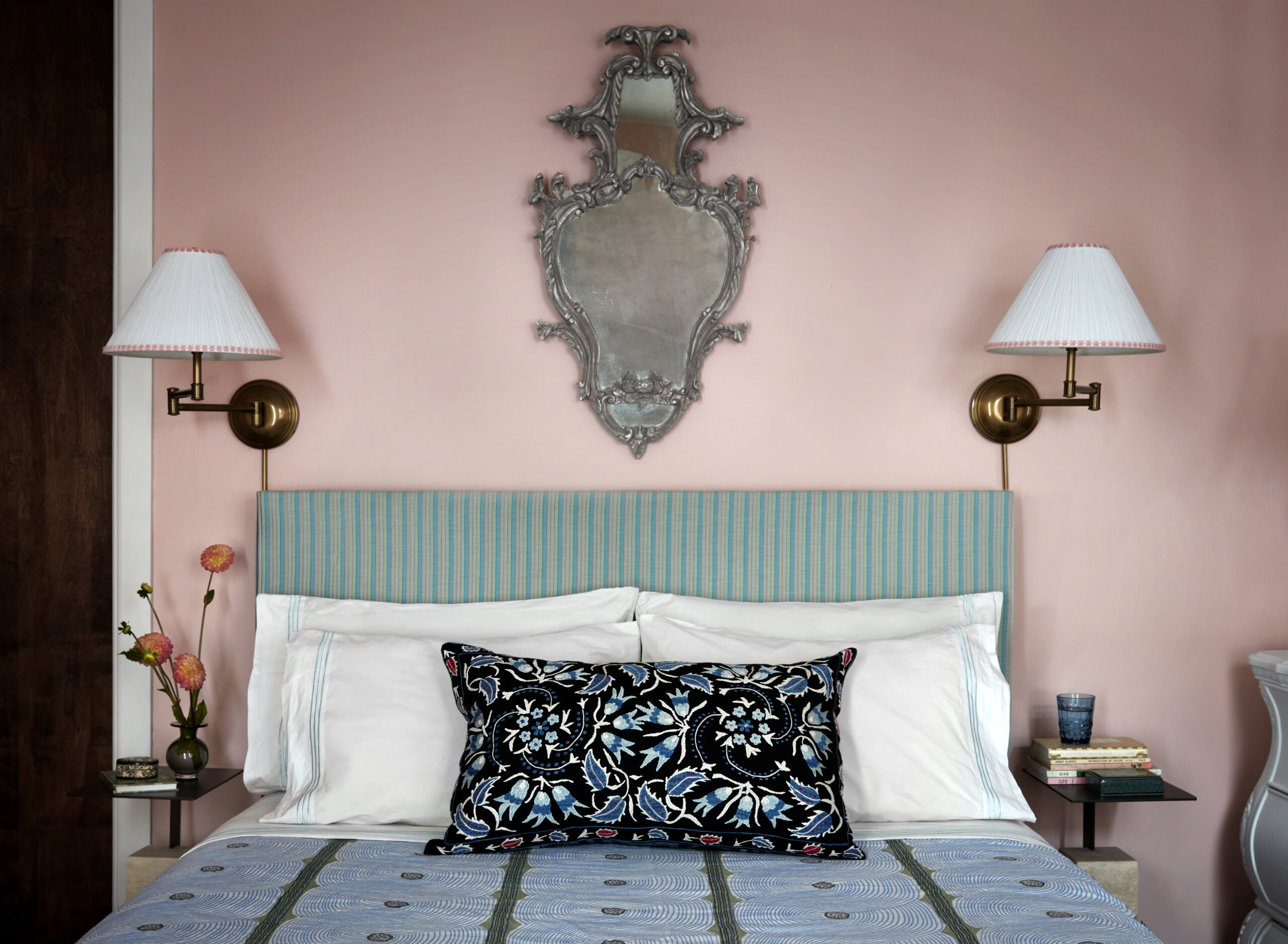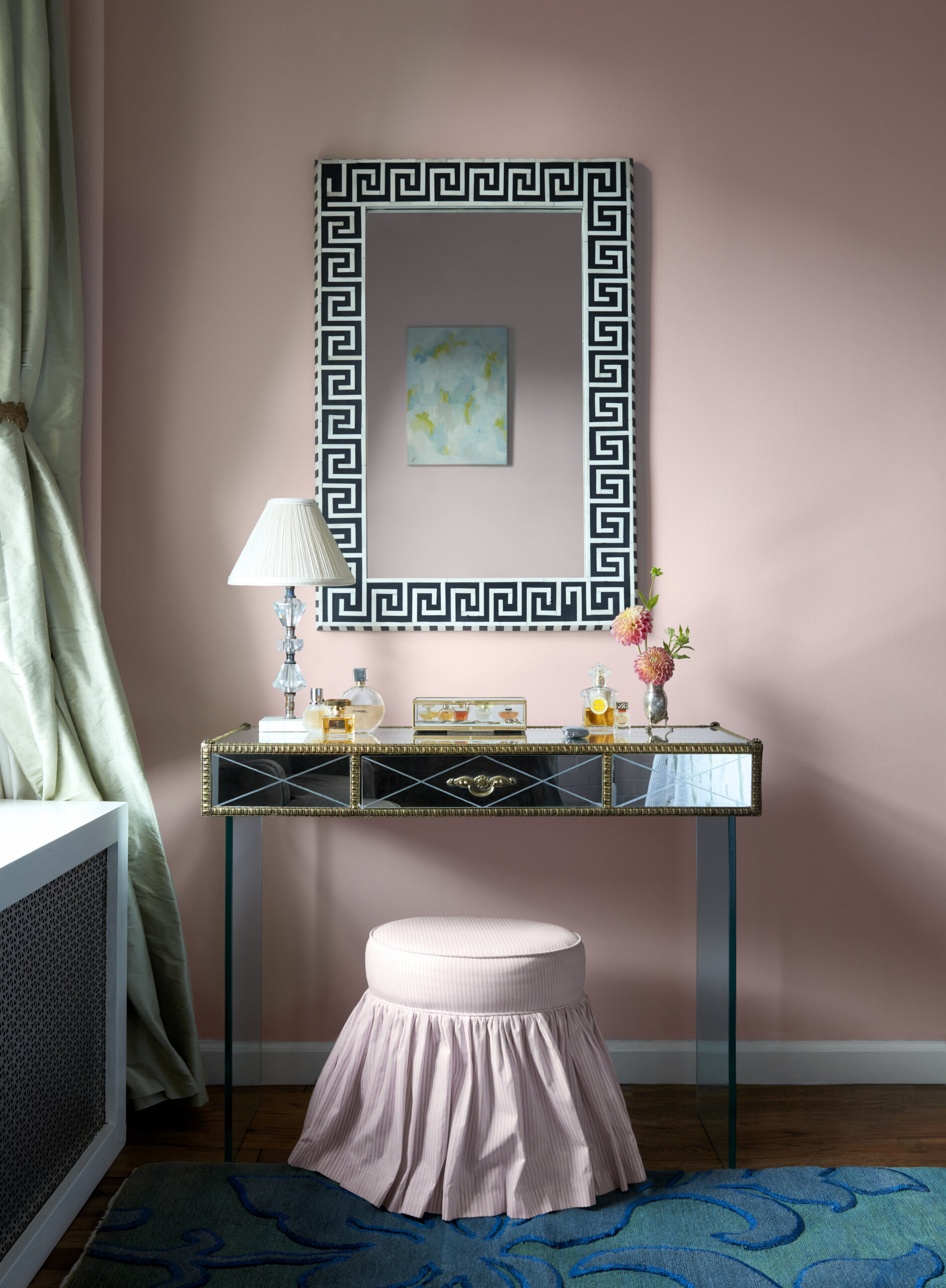 McCauley incorporated a variety of textures in the primary bedroom to make it feel layered and lush, including an upholstered headboard of pleated silk georgette and silk taffeta curtains. The 1950s mirrored vanity, mirror above it and white dresser all came from Hayloft Auctions in the Bronx.
