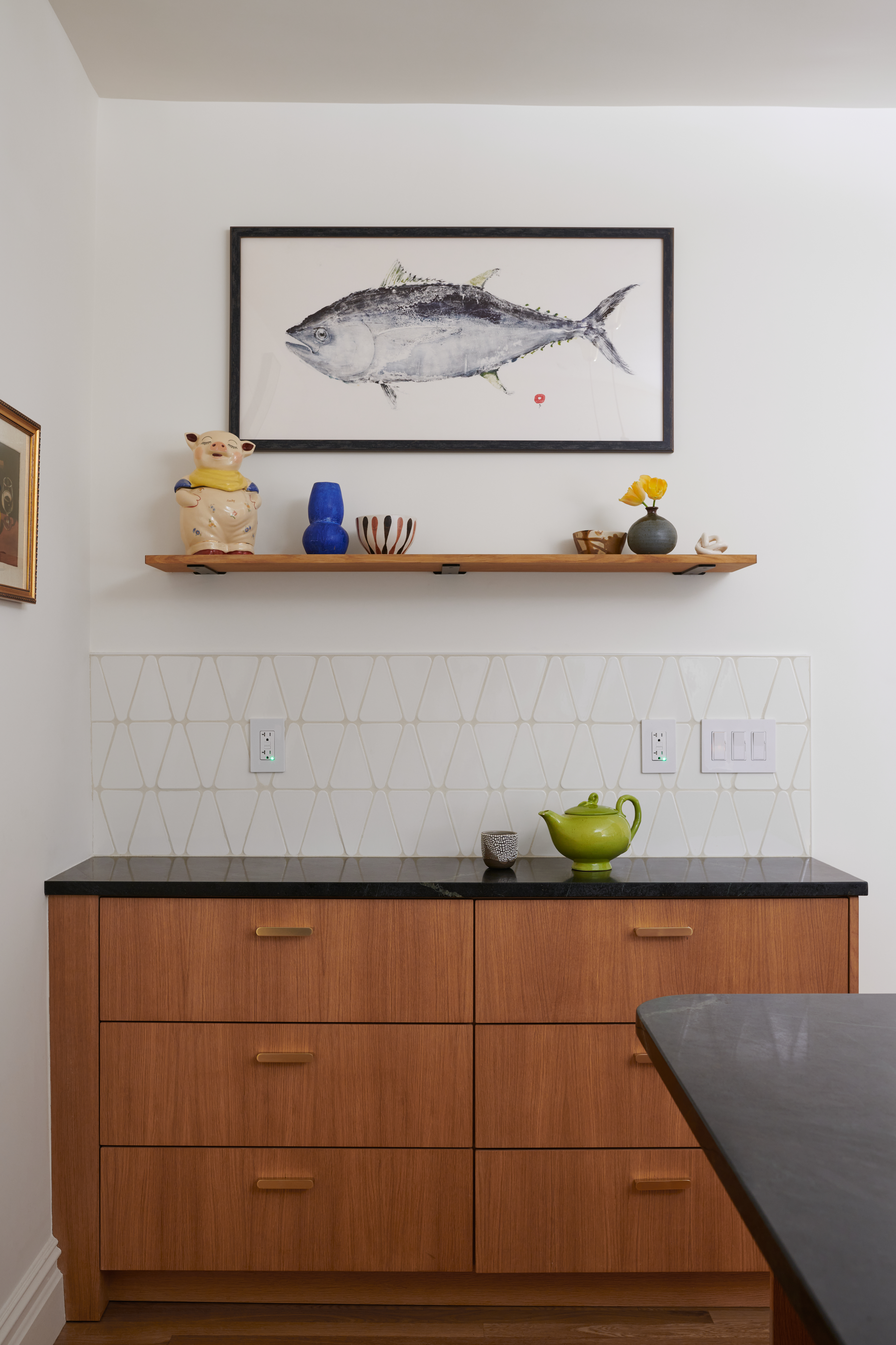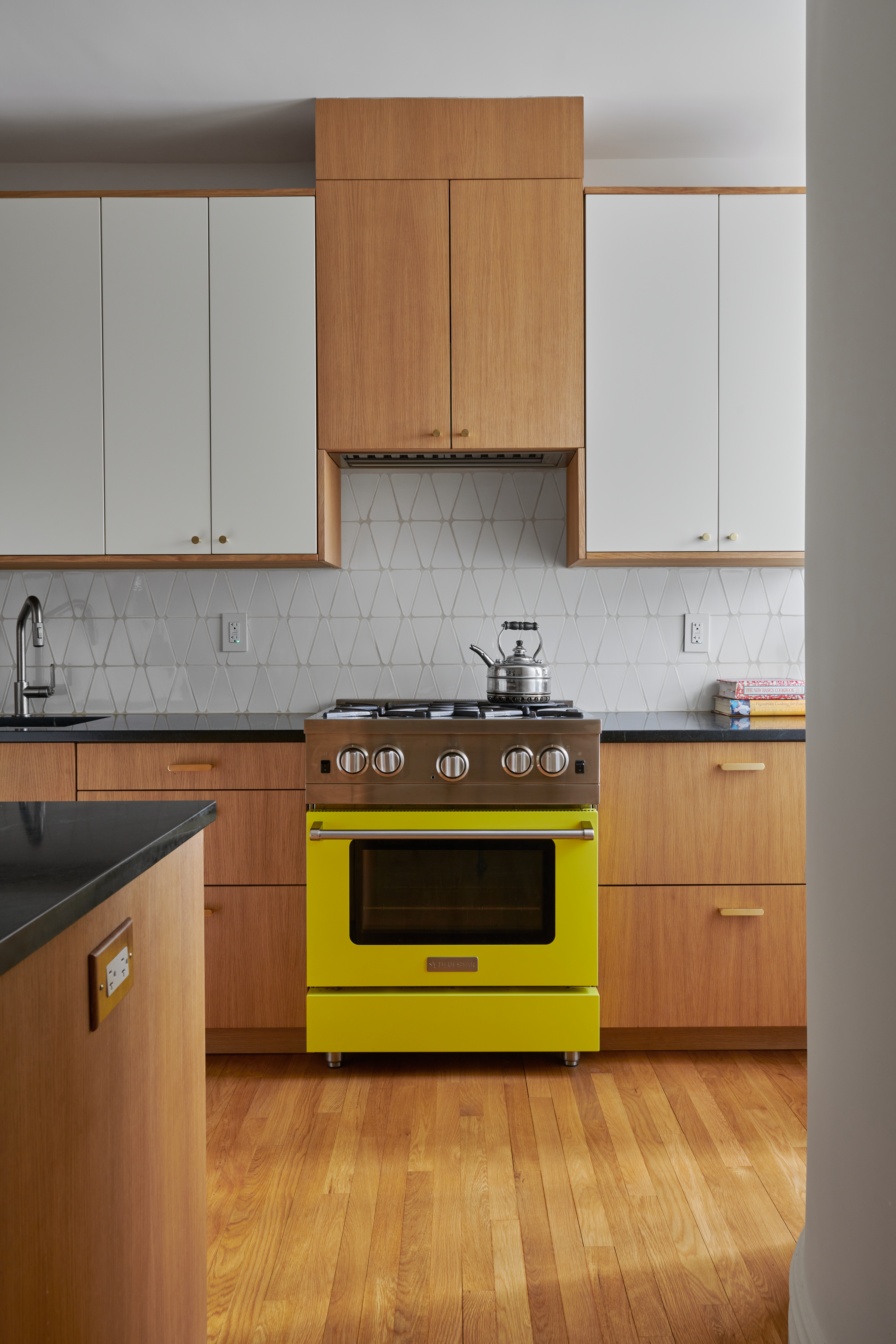 Warm wood cabinetry from Reform was customized with trim. White oak cabinets below, with some painted uppers, along with black soapstone countertops, handmade wedge-shaped backsplash tiles from Modwalls with midcentury character, and red pendant lights, create a playful dynamism. An additional console was inserted into a corner for extra counter space.