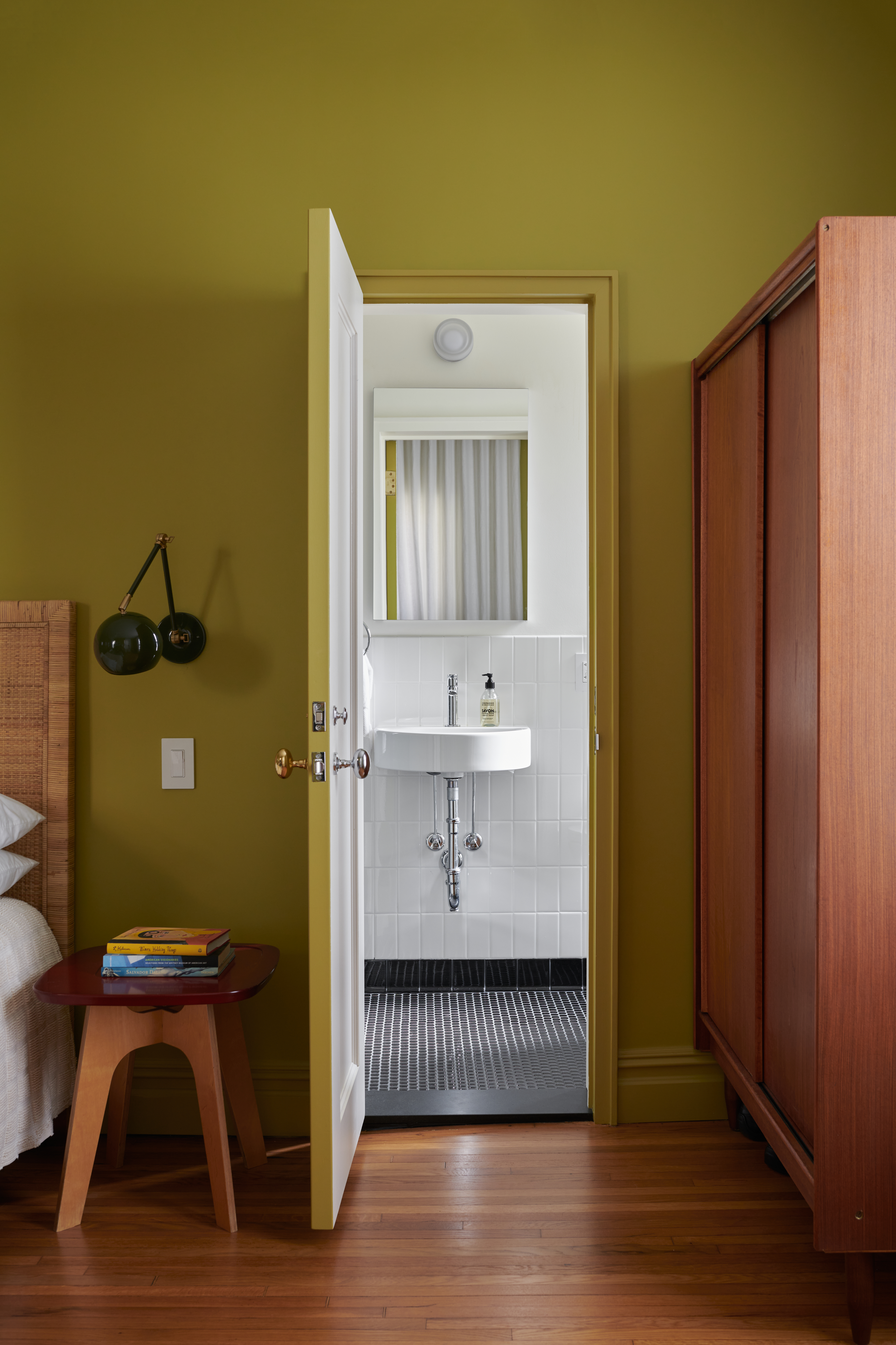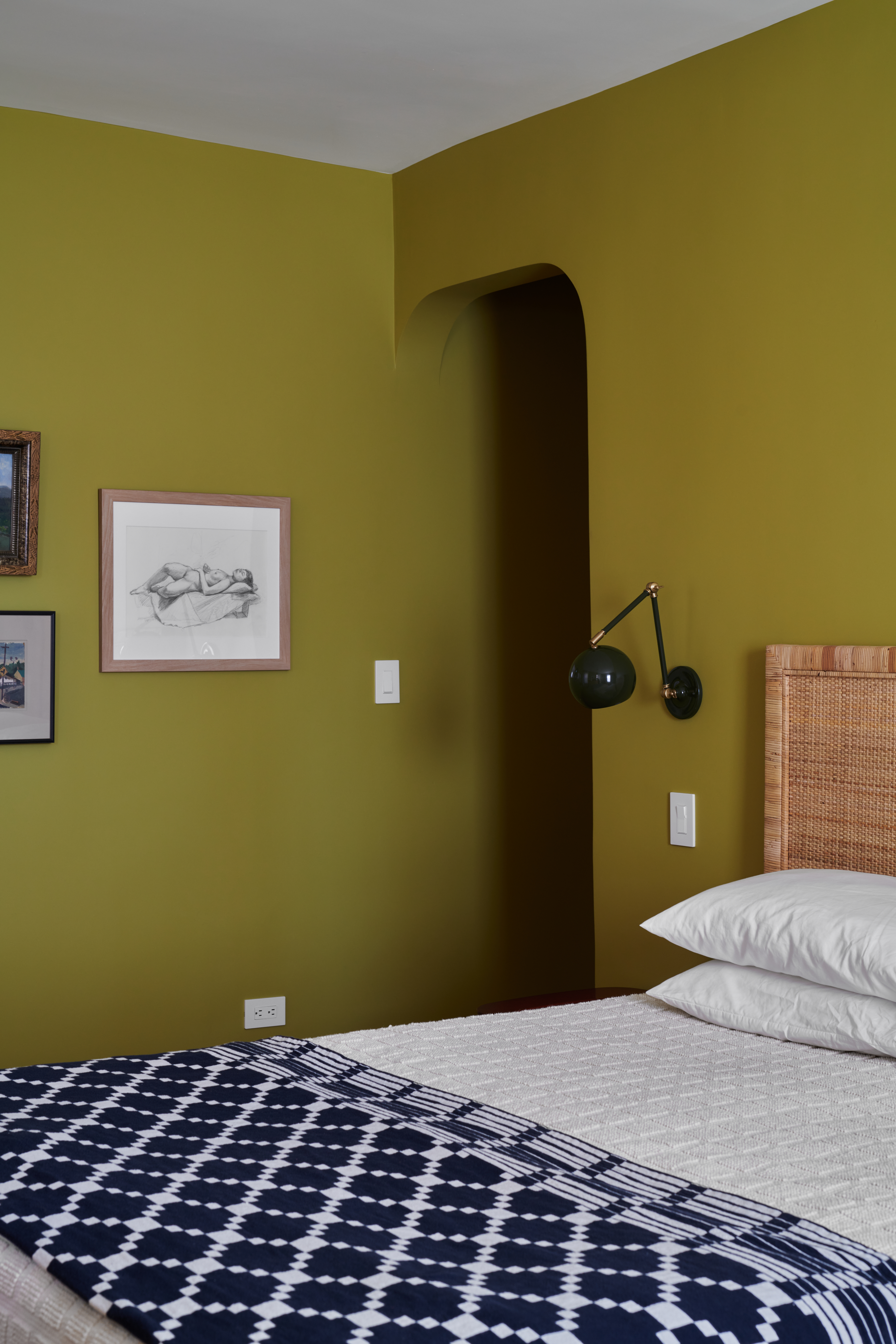 Wasabi paint by Benjamin Moore, a rich green, distinguishes the primary bedroom.