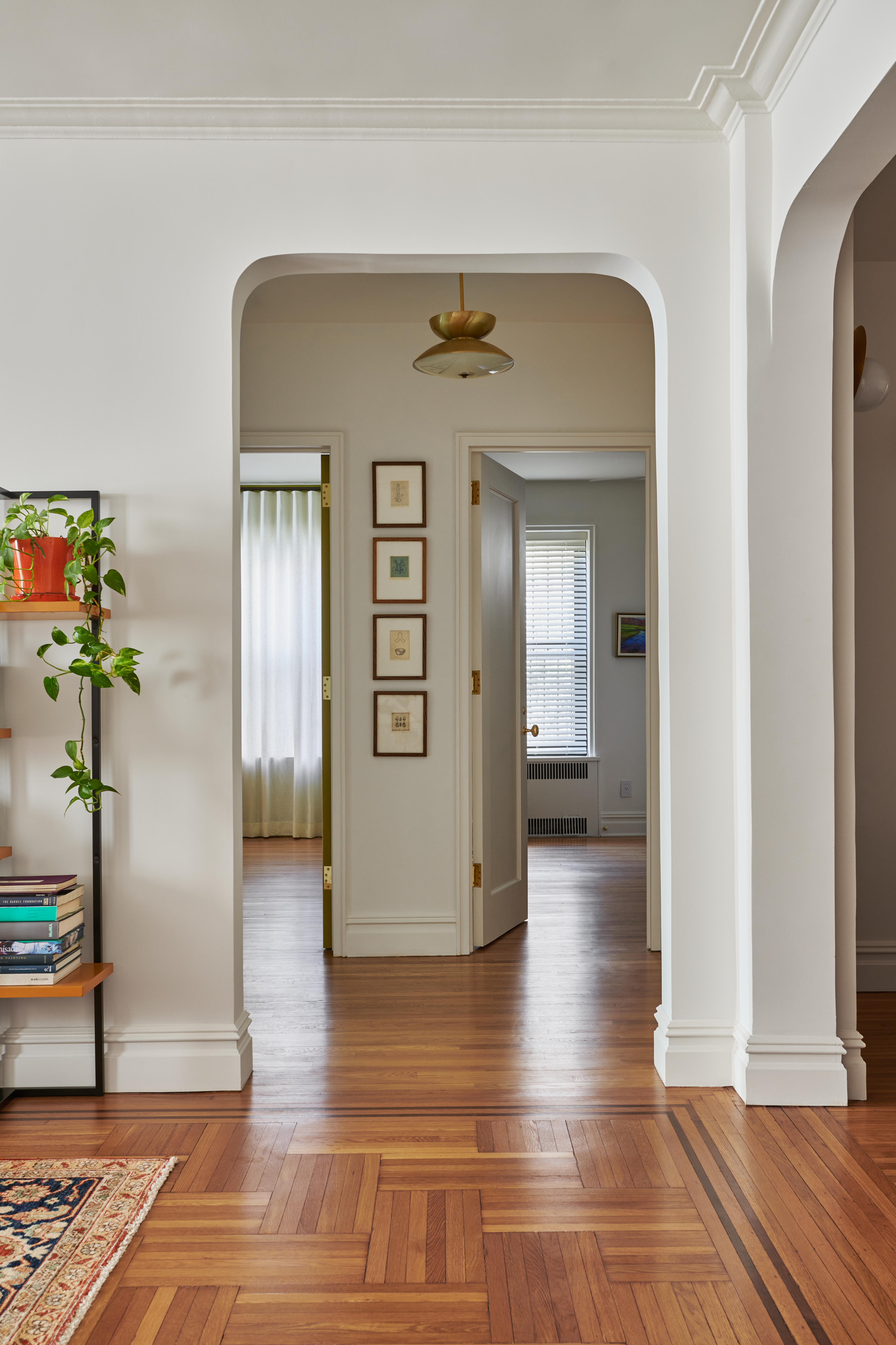 Jacoby added a wide arched opening in a solid wall to admit light into the living room from the rooms opposite — a bedroom on the left and the office-turned-studio on the right.