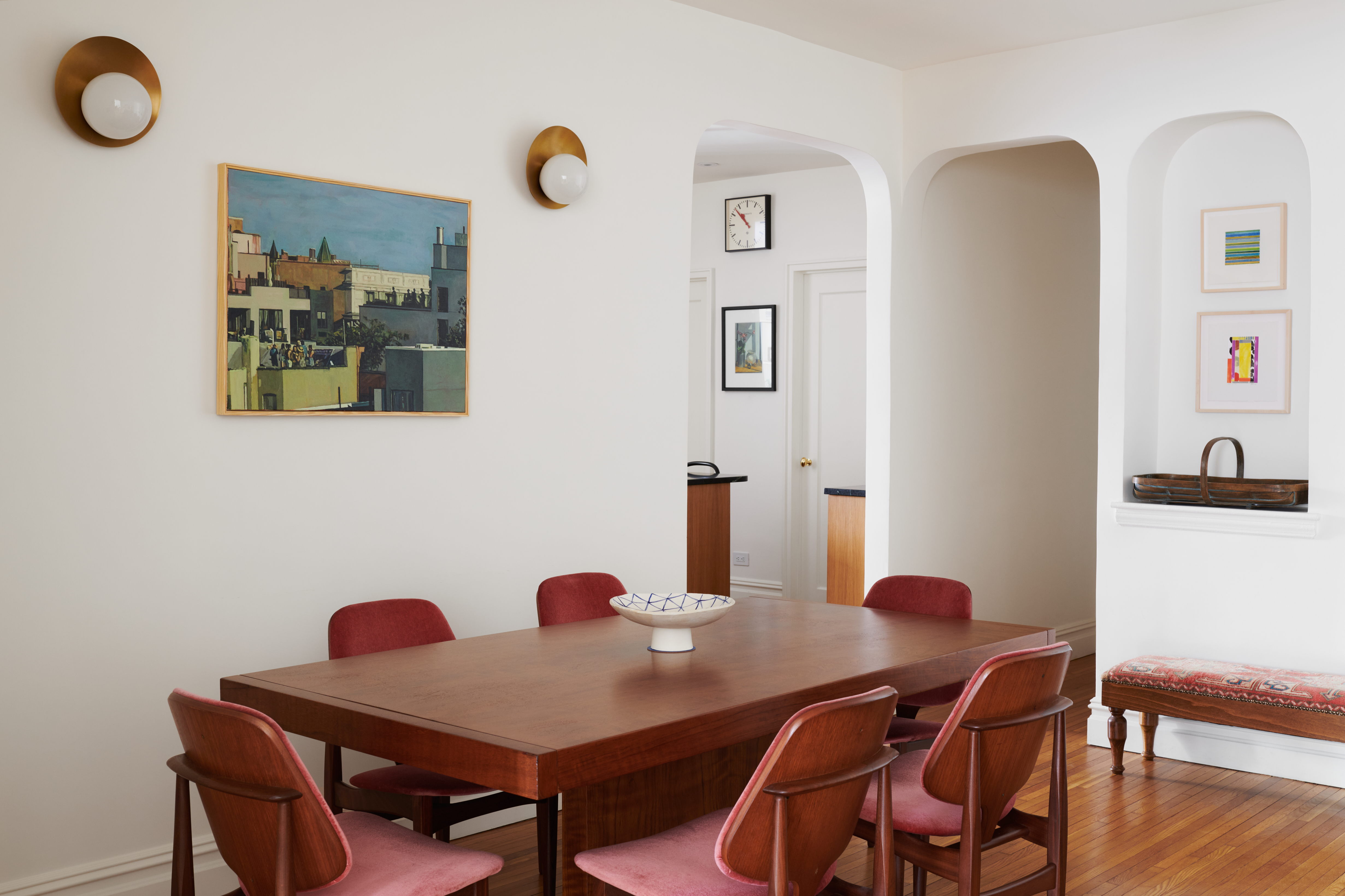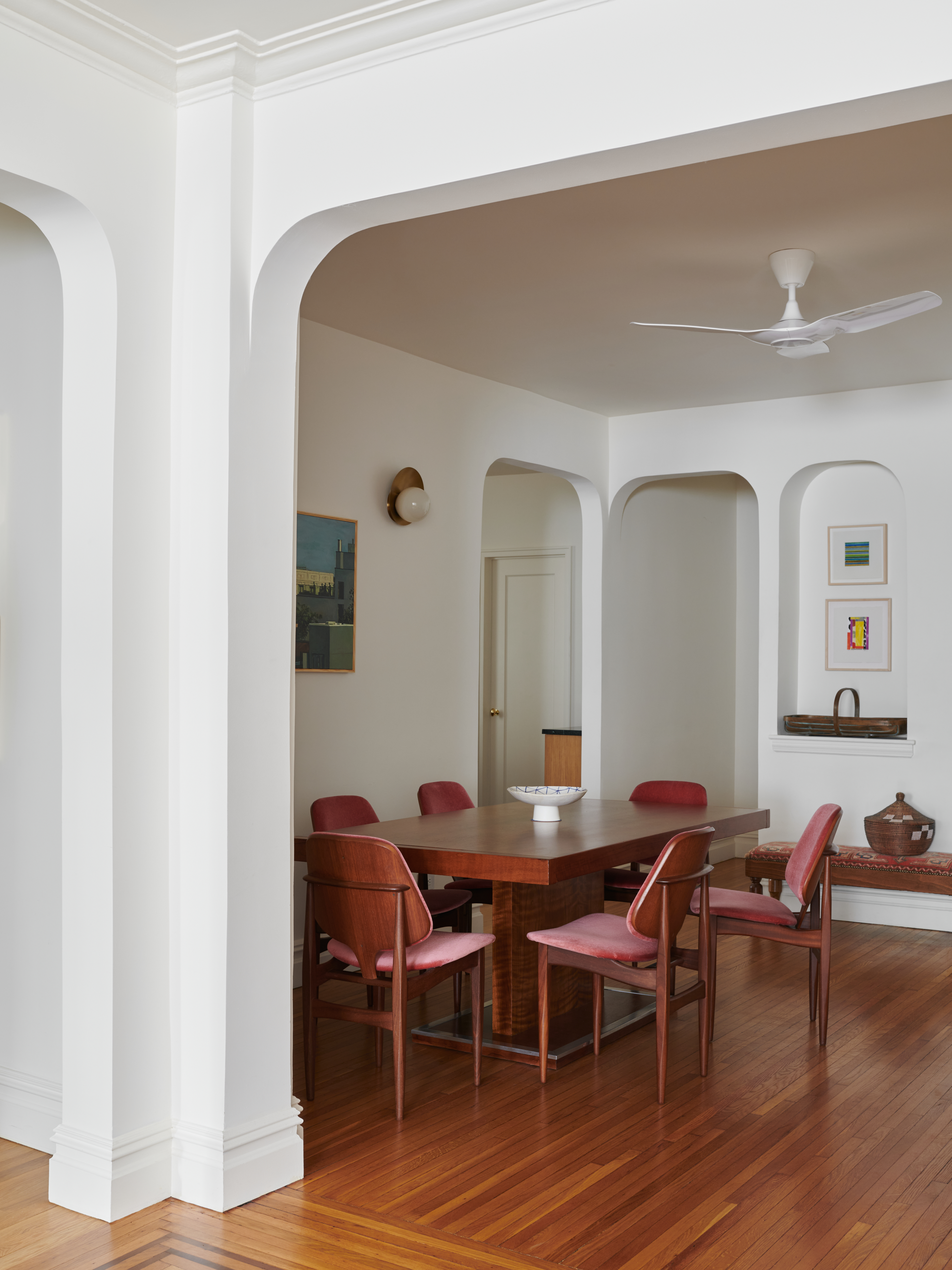 The apartment’s main entry door opens into the dining room, which retains an original wall niche.