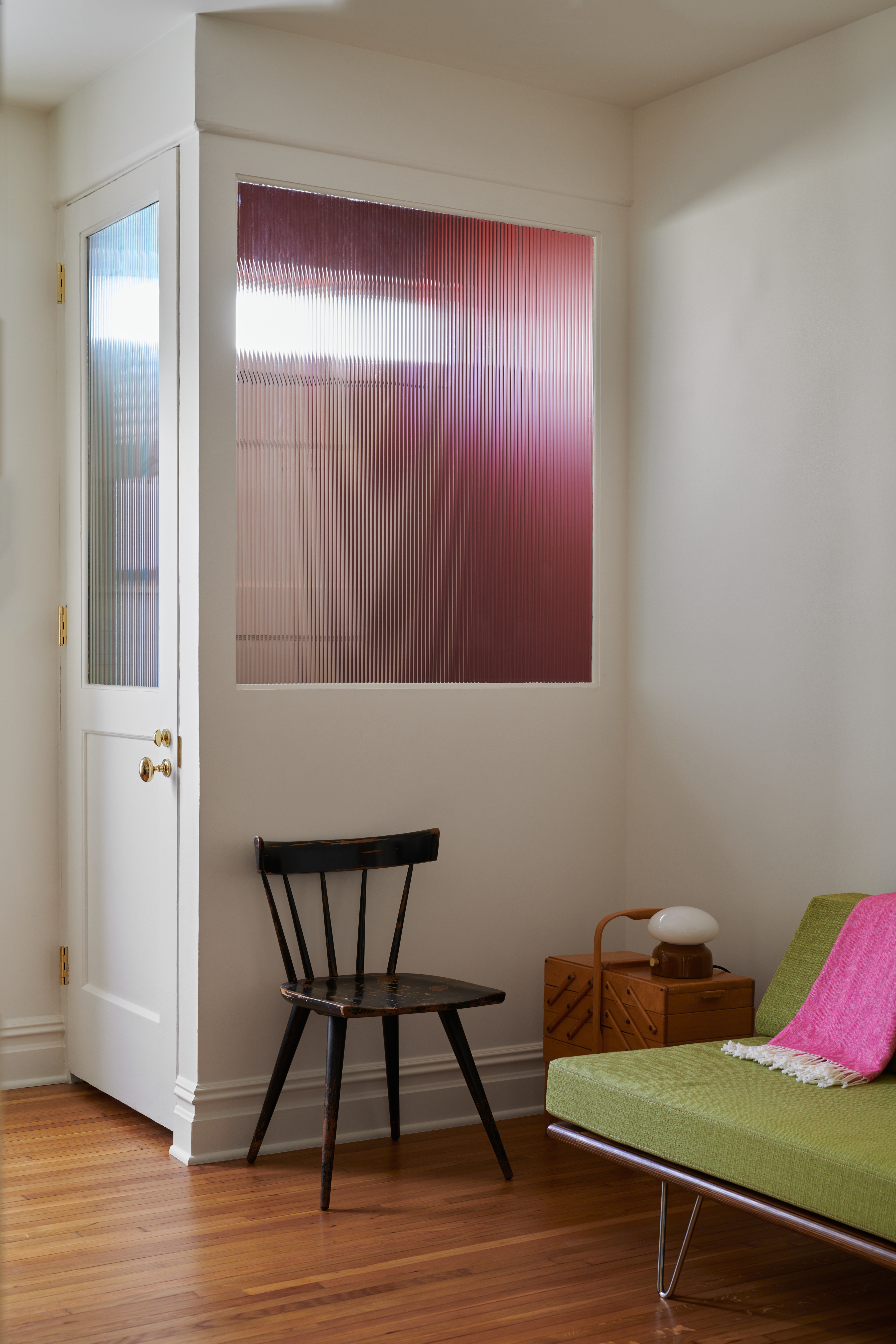 A tiny existing vestibule into the office — a second entry into the apartment from the street — helps keep out cold air. It was salvaged and painted Pomegranate by Benjamin Moore, which makes its clear fluted glass panel appear pink.