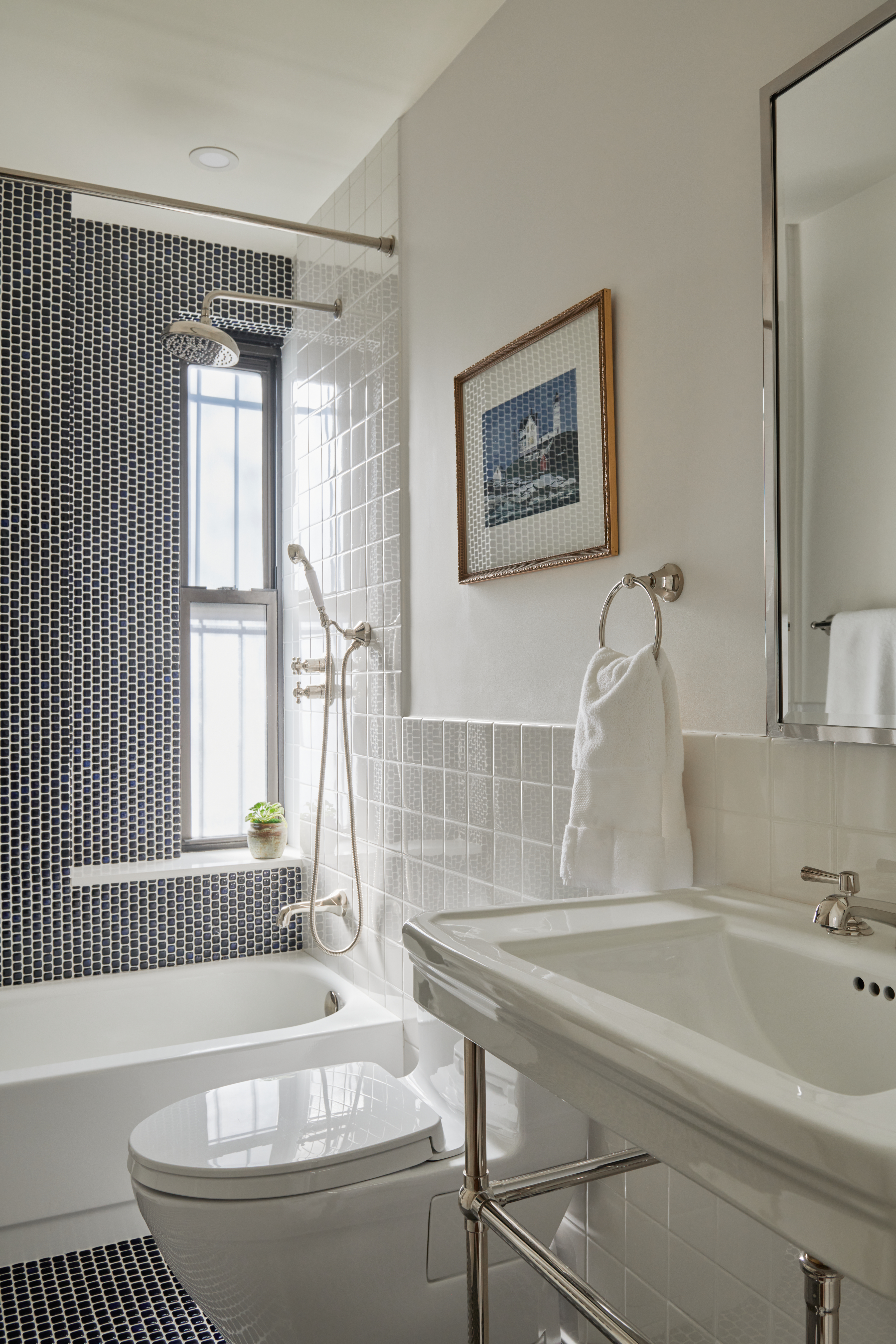 The ensuite bath is back-to-back with the apartment’s secondary bathroom, splitting a window. “We tried to come up with a palette that felt refreshed without spending a fortune,” Jacoby said. “We went very simple on the tiles, but had them be cousins of each other.” A sink on chrome legs in one of the bathrooms clearly recalls the 1930s.